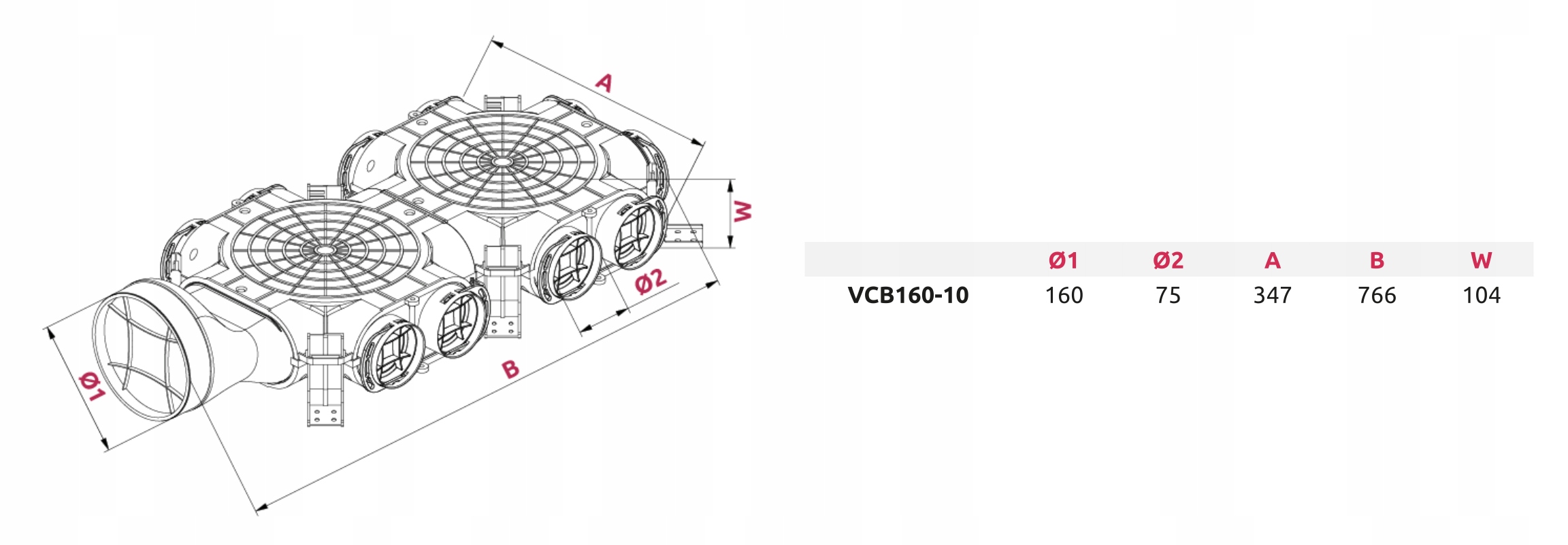 Распределительная коробка Awenta PRO VCB160-10 позволяет подключить до 10 вентиляционных каналов Ø75. Как и в других распределительных коробках серии VCB, неиспользуемые соединения можно закрыть с помощью входящих в комплект герметичных заглушек. Коробка характеризуется боковым подключением диаметром Ø160 мм.