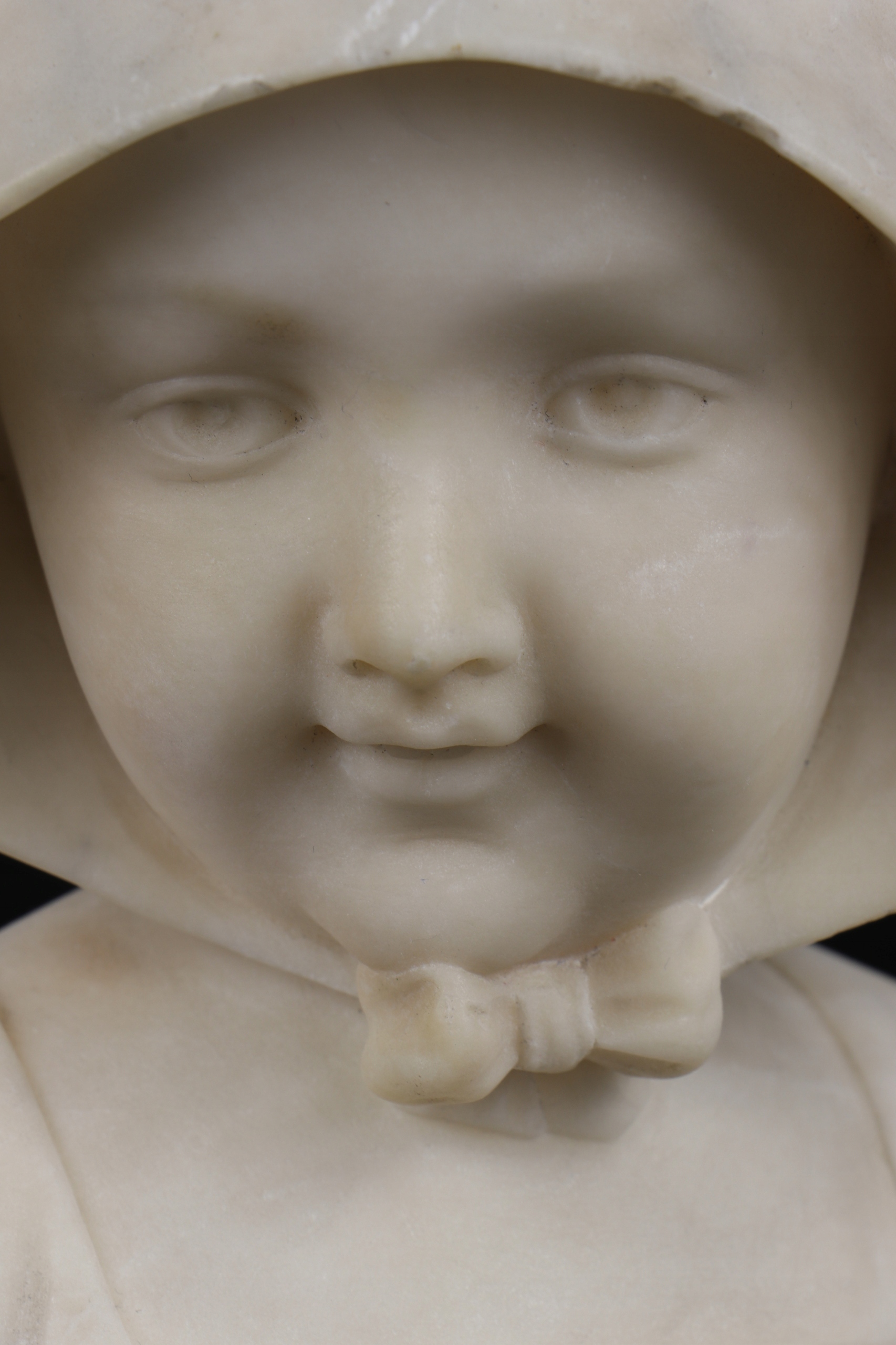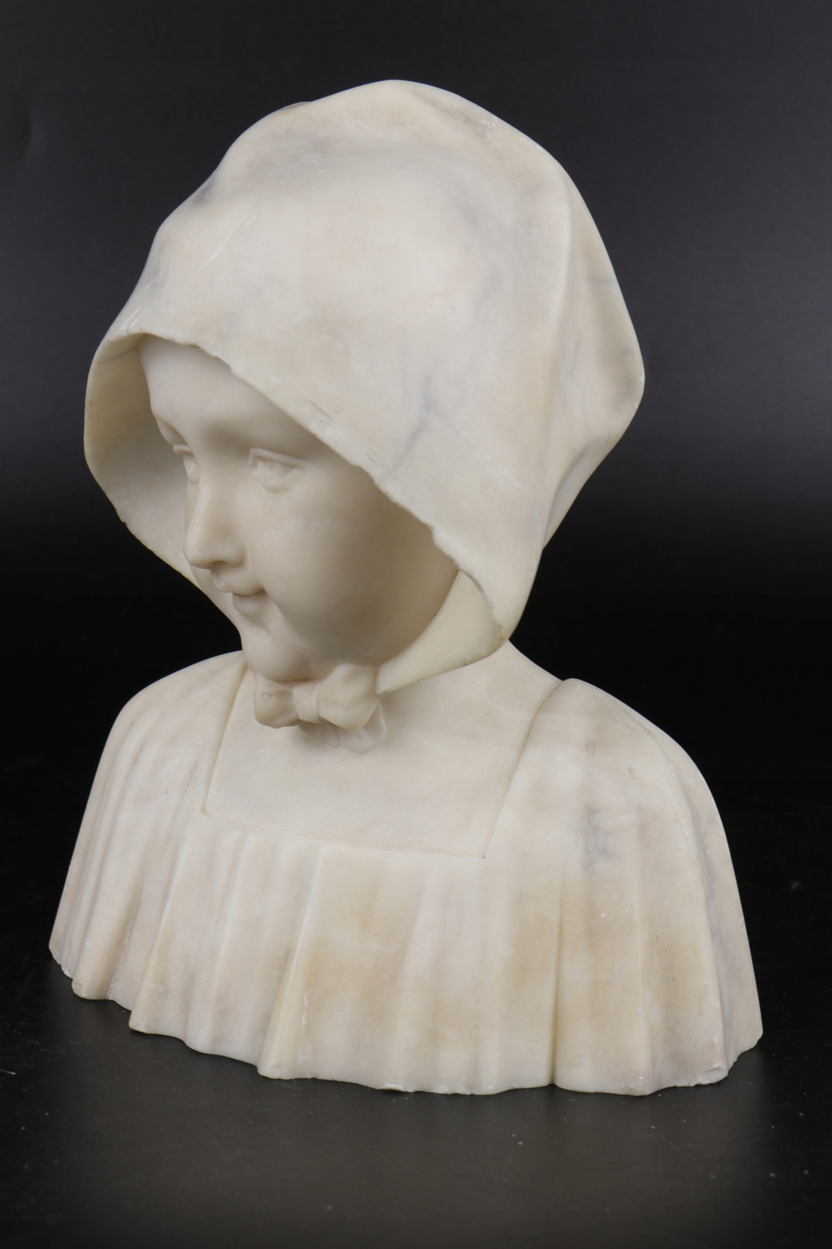 Интересная старая скульптура молодой девушки ребенка в характерном капюшоне. Скульптура, сделанная в алебастере. Натуральный камень можно увидеть разные оттенки камня. Голова девушки очень хорошо сделана. Однако скульптура не подписана, что скульптор, созданный художником. : 1900