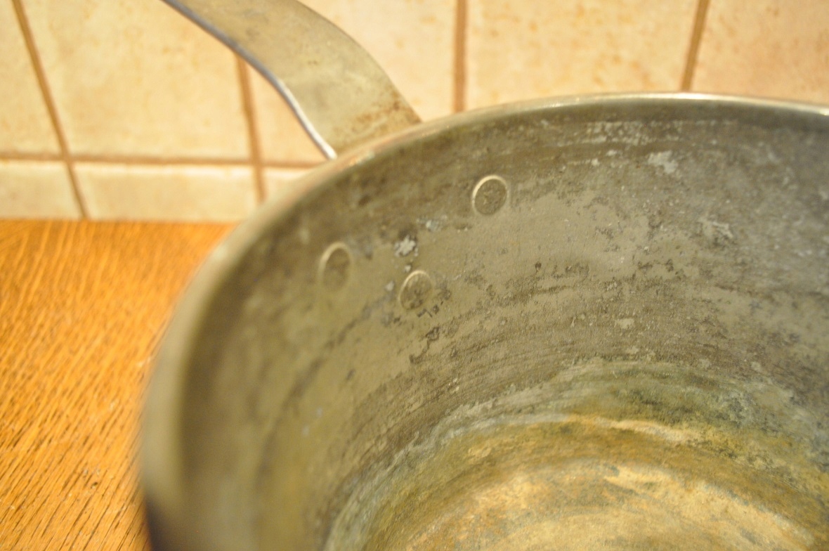Внутри сосуд покрыт старым, ржавым (каменным?) покрытием.