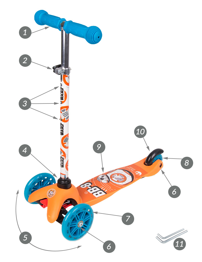 - На самокате установлены колеса на заводе, достаточно соединить руль с защелкой и он готов к использованию согласно прилагаемой инструкции.