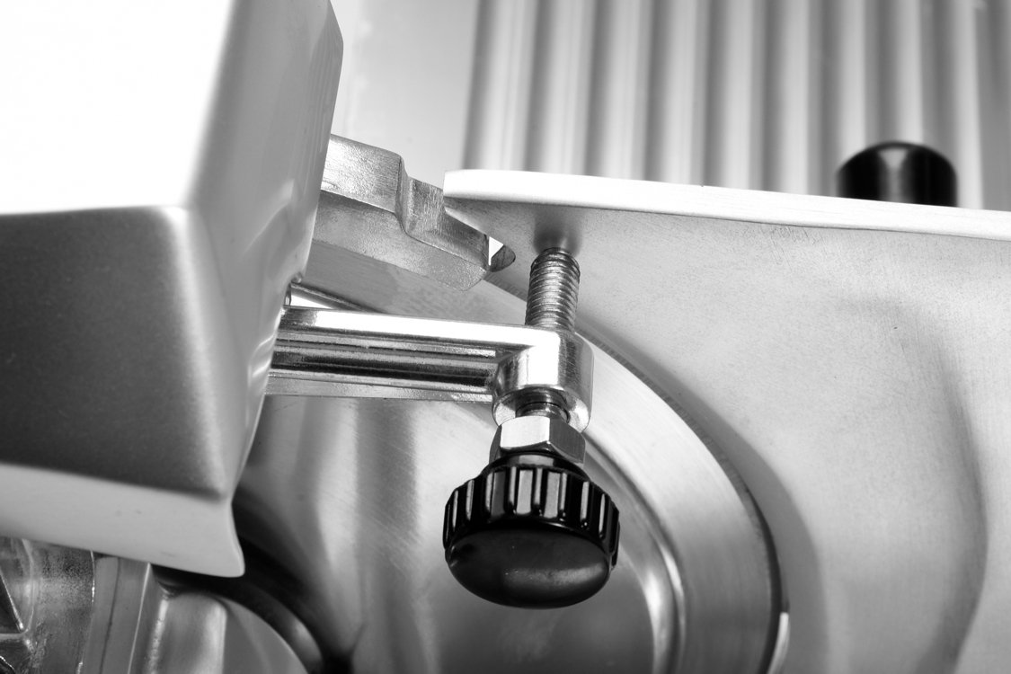 Тележка, установленная на направляющих с подшипниками, работает очень легко и плавно, что существенно снижает усилия при резке. Кроме того, режущий механизм, то есть каретка и диск, расположены по диагонали. Таким образом, разрезаемые продукты прижимаются к диску под действием силы тяжести, уменьшая требуемое усилие.