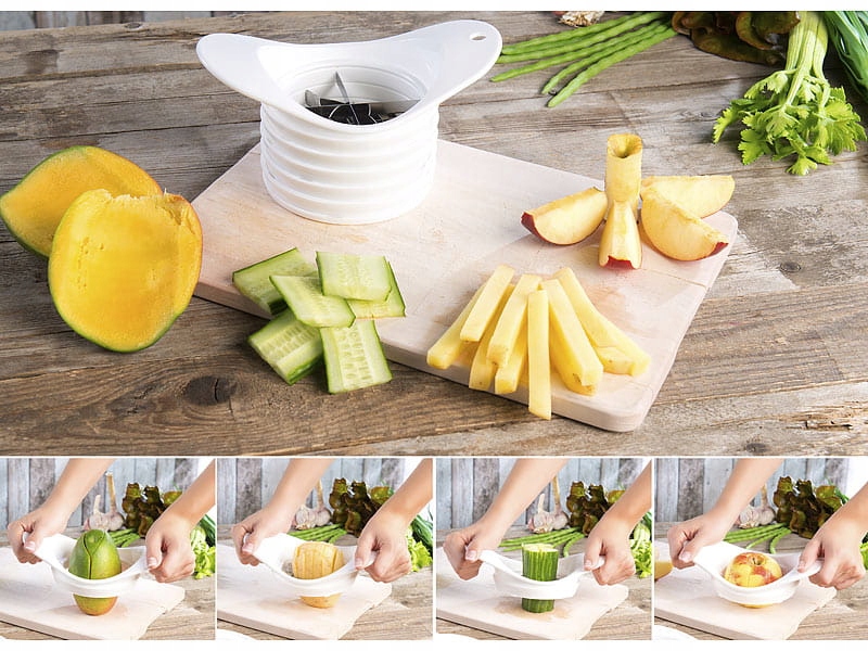 Нарезать фрукты обычным ножом зачастую сложно и не всегда получается разрезать их на одинаковые кусочки. Именно поэтому мы рекомендуем иметь на кухне специальную овощерезку для фруктов и овощей.