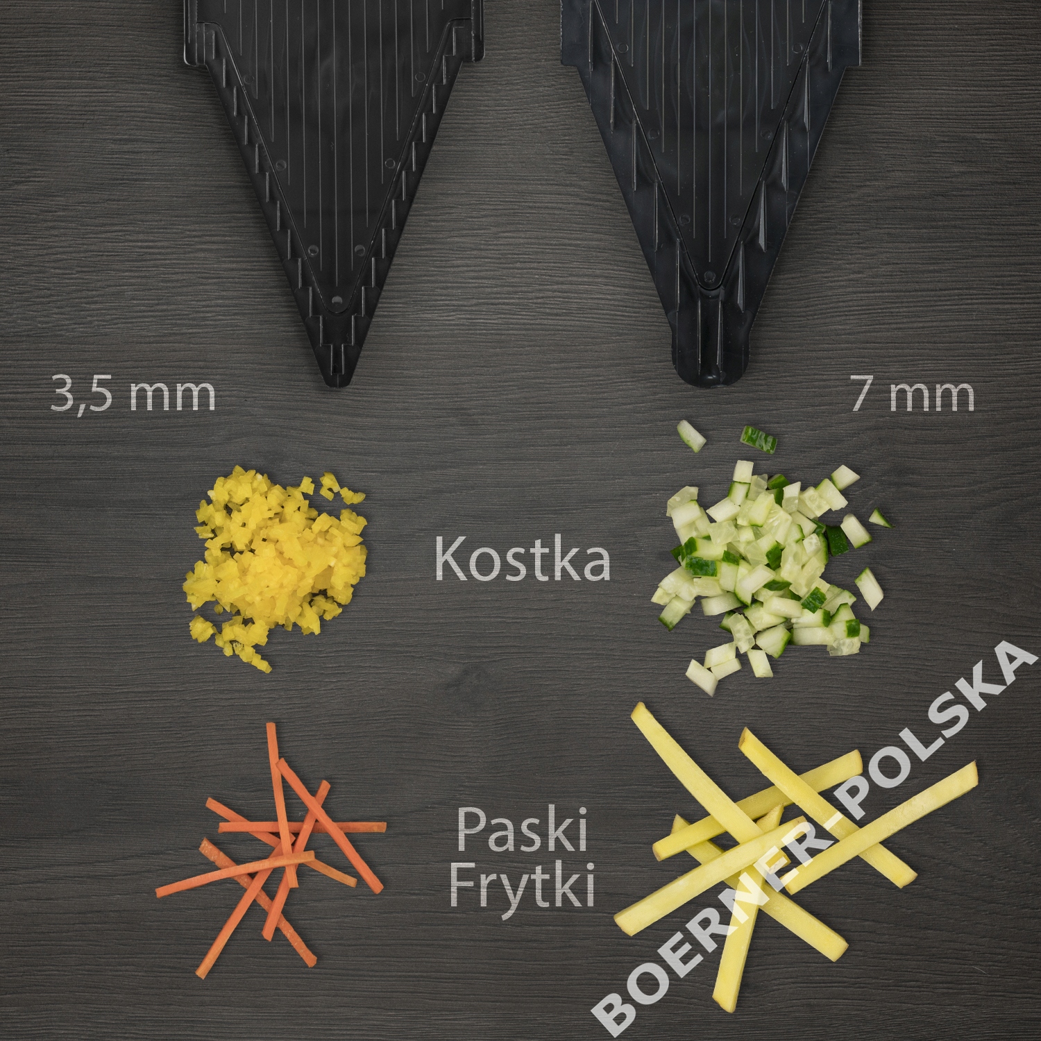 - Вставка без ножей – т. н. вставка 0 – это единственная вставка, которую можно использовать с обеих сторон. Используя одну сторону, мы получим тонкие ломтики 1,3 мм, а перемещая вставку на другую сторону, получим толстые ломтики 4,5 мм.