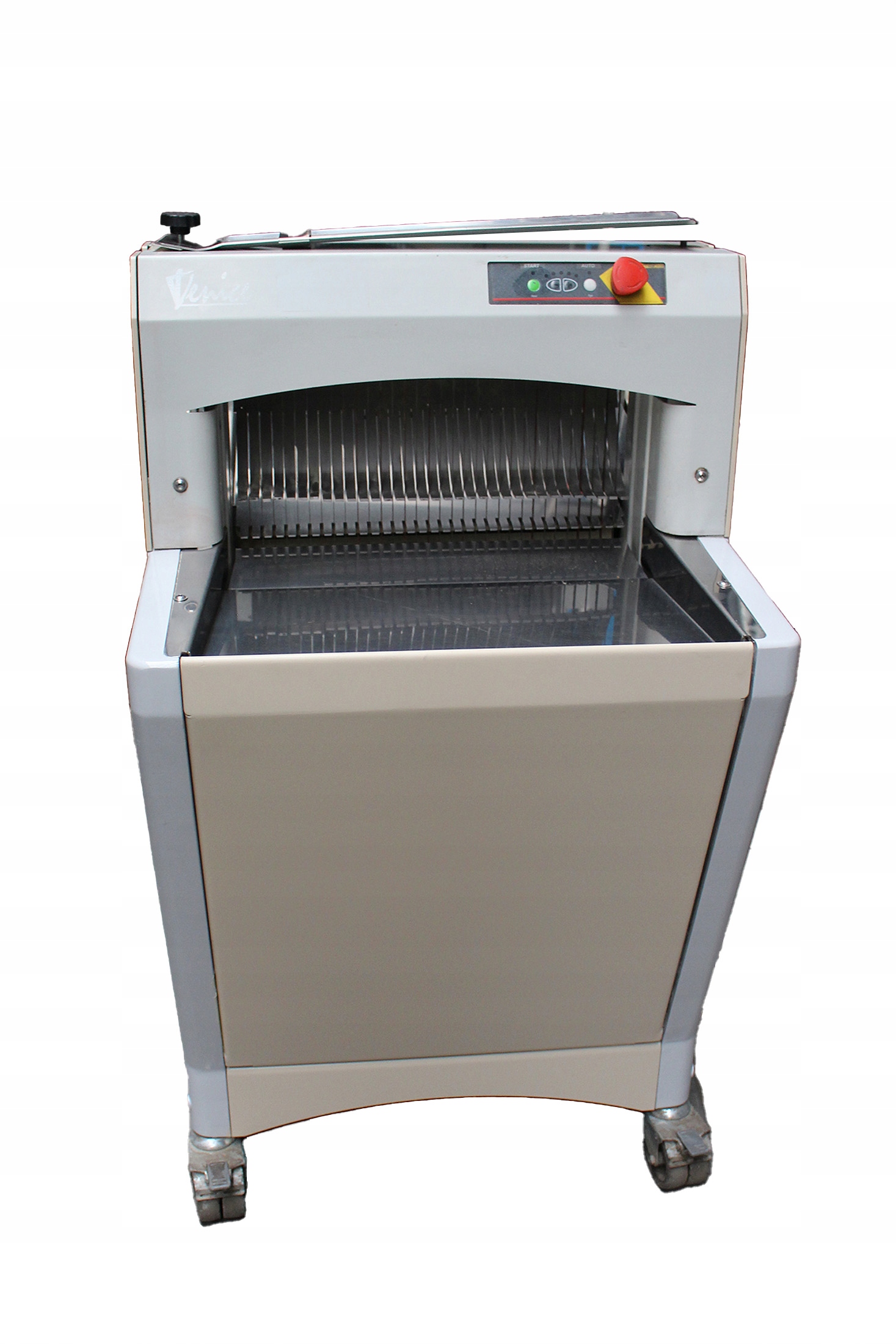Устройство оснащено рычагом, благодаря тому, что ограничитель настроен на то, чтобы прижать хлеб к позиции, что позволяет положить хлеб в слайсер. Этот ограничитель с пружиной возвращается в свое первоначальное положение, и хлеб, проходящий через ножи, разрезан. Slicer оснащен вождением роликов в стандартной комплектации. Устройства имеют хлеб для упаковки хлеба в мешки.