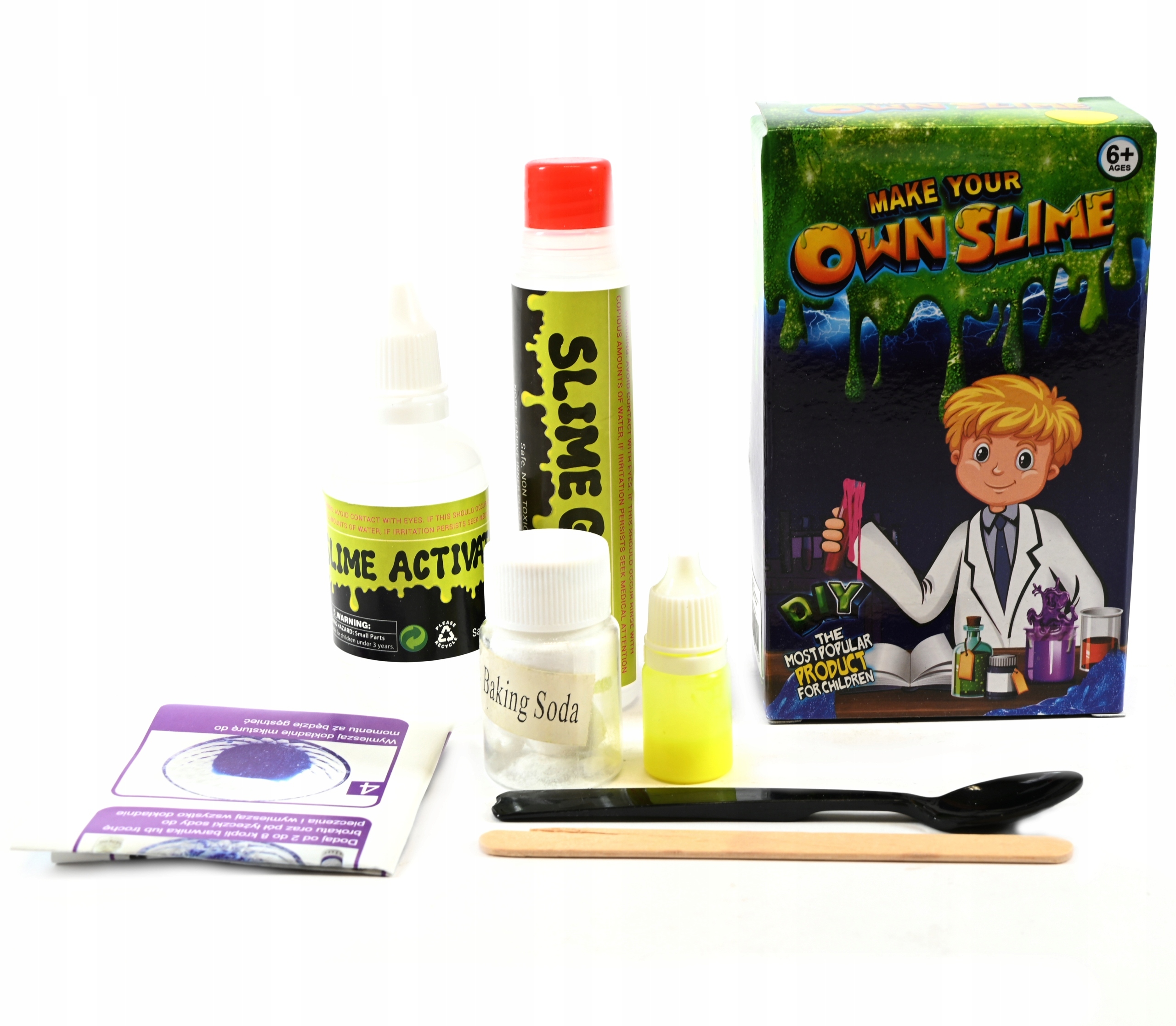 Что в наборе? Бутылочка с активатором, бутылочка с клеем и емкость с пищевой содой, бутылочка с красителем, ложка, палочка и, конечно же, инструкция, которая шаг за шагом проведет вас через процесс создания собственных слаймов.