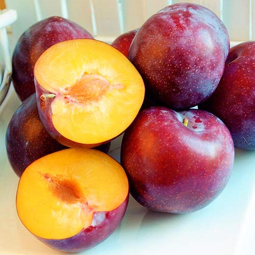 Большие мясистые сливы с сферической формой. Розово-фиолетовая кожа покрыта румянцем. Желтая мякоть, очень сочная, чрезвычайно вкусная, легко уходящая от камня.