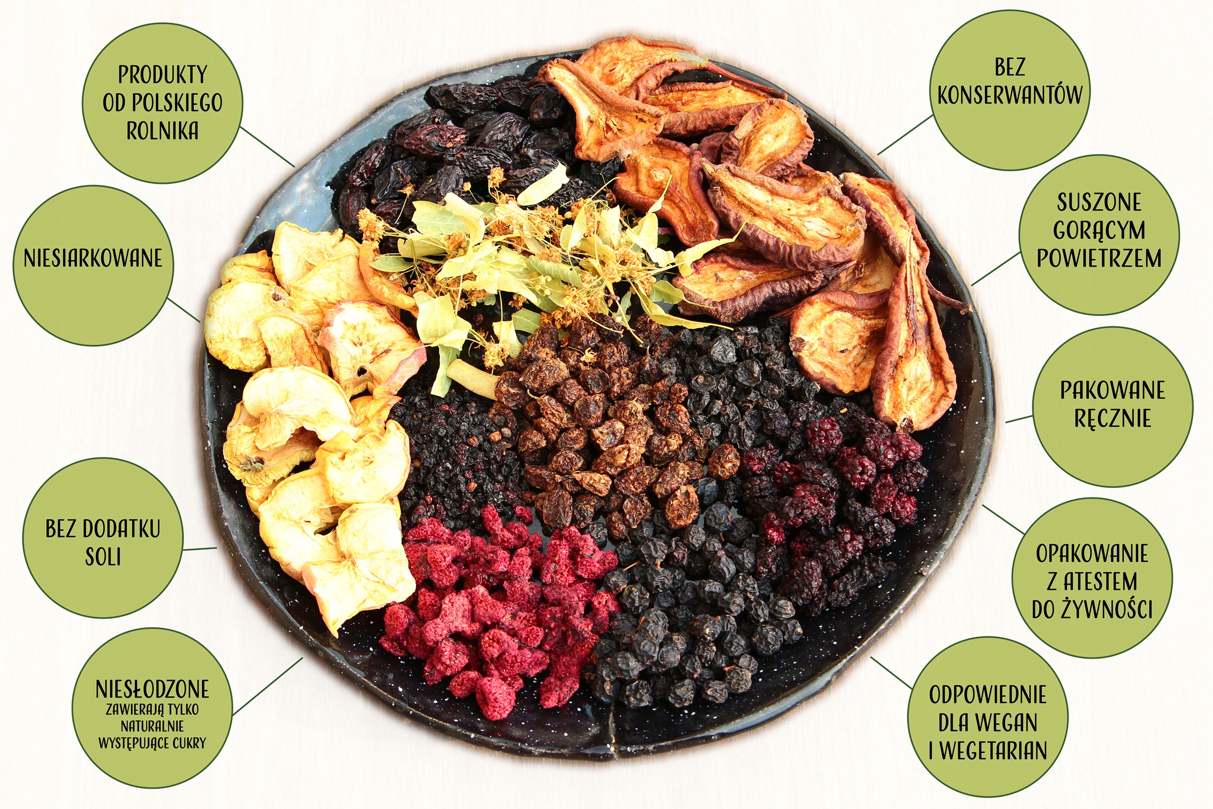 Вы ищете продукты, богатые витаминами? Вы заботитесь о натуральных продуктах без консервантов? Наши сушеные фрукты просто так! Сырье поступает прямо от польского фермера. Композиция составляет 100% фрукты без добавления подсластителей, только природные сахары. Избавление от правильного количества воды означает, что плесень, дрожжи и бактерии не могут развиваться, что влияет на дату длительного истечения без симптомов коррупции. Мы сушат наши фрукты горячим воздухом, благодаря тому, что мы эффективно консолидируем вкус и аромат продуктов