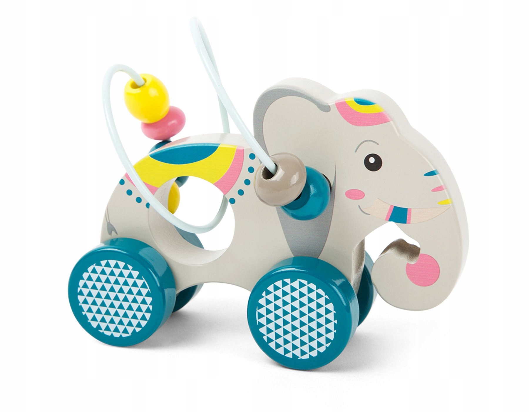 Этот красиво сделанный серый слон, украшенный яркими мотивами, имеет металлическую петлю с разноцветными бусинами на спине. Их можно перемещать вверх и вниз, пока длится цикл. Животное установлено на 4 синих колесах, поэтому на нем можно быстро кататься. Эта уникальная моторная петля надолго займёт вашего малыша!