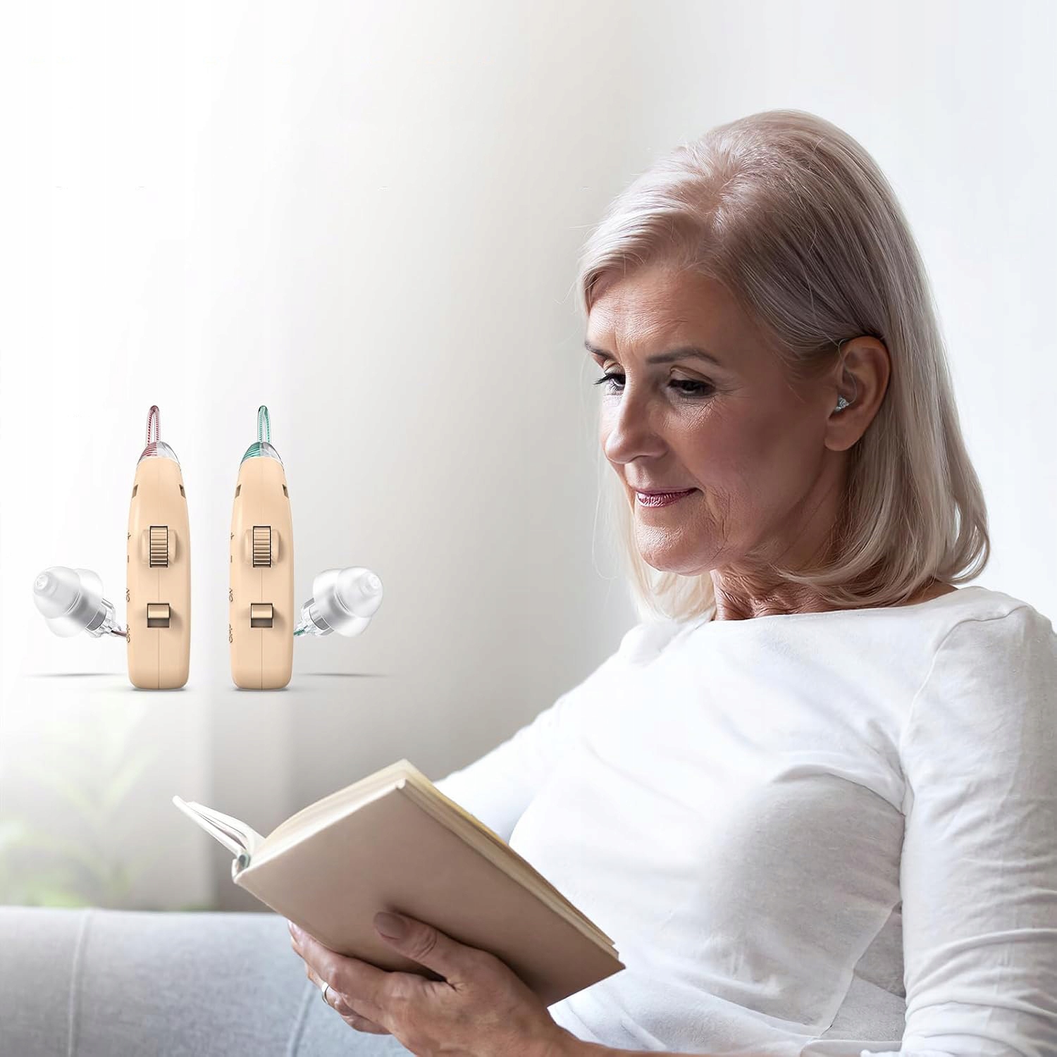 Удобство ношения: эти слуховые аппараты имеют почти невидимую конструкцию, которая удобно помещается под волосами и позволяет использовать их незаметно. Эргономичный дизайн идеально вписывается в ушной канал, снижая усталость, вызванную длительным ношением, и делает их идеальными для пожилых людей, которые хотят сохранить свою независимость.