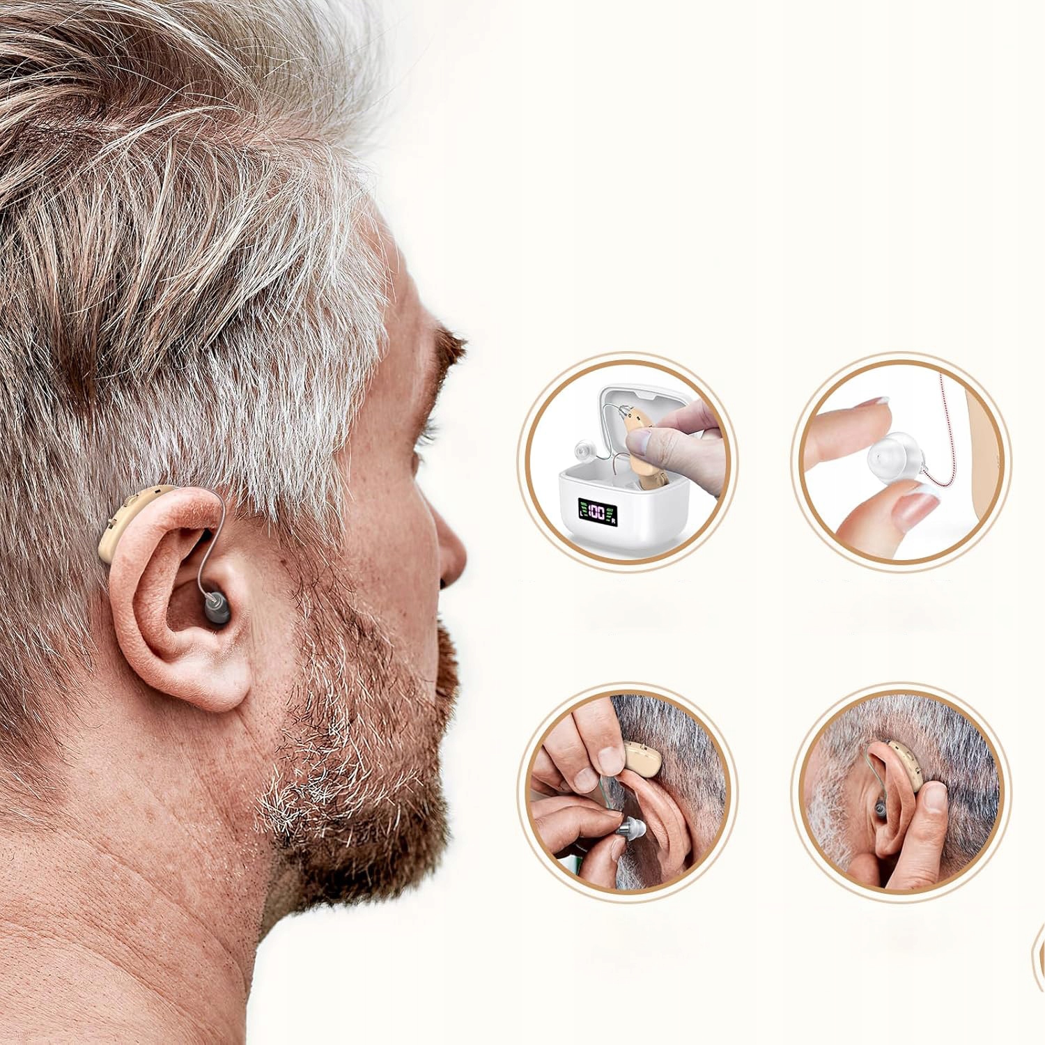 Удобство ношения: эти слуховые аппараты имеют почти невидимую конструкцию, которая удобно помещается под волосами и позволяет использовать их незаметно. Эргономичный дизайн идеально вписывается в ушной канал, снижая усталость, вызванную длительным ношением, и делает их идеальными для пожилых людей, которые хотят сохранить свою независимость.