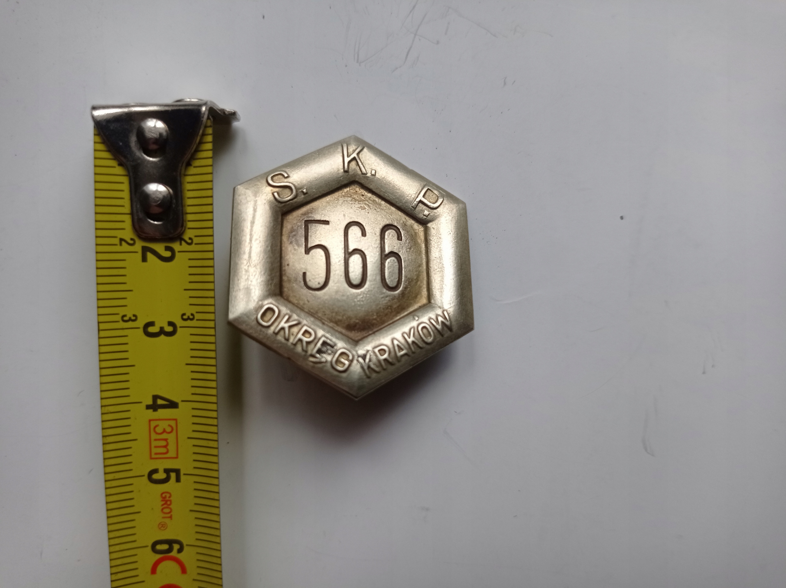 Шестиугольник, 566 штампованный внутри, вокруг С.К.П. - КРАКОВСКИЙ РАЙОН, одно- кусок значка, отбитый жетоном, закрепленный на столбе, гайка с подписью MENNICA - ГОСУДАРСТВЕННАЯ