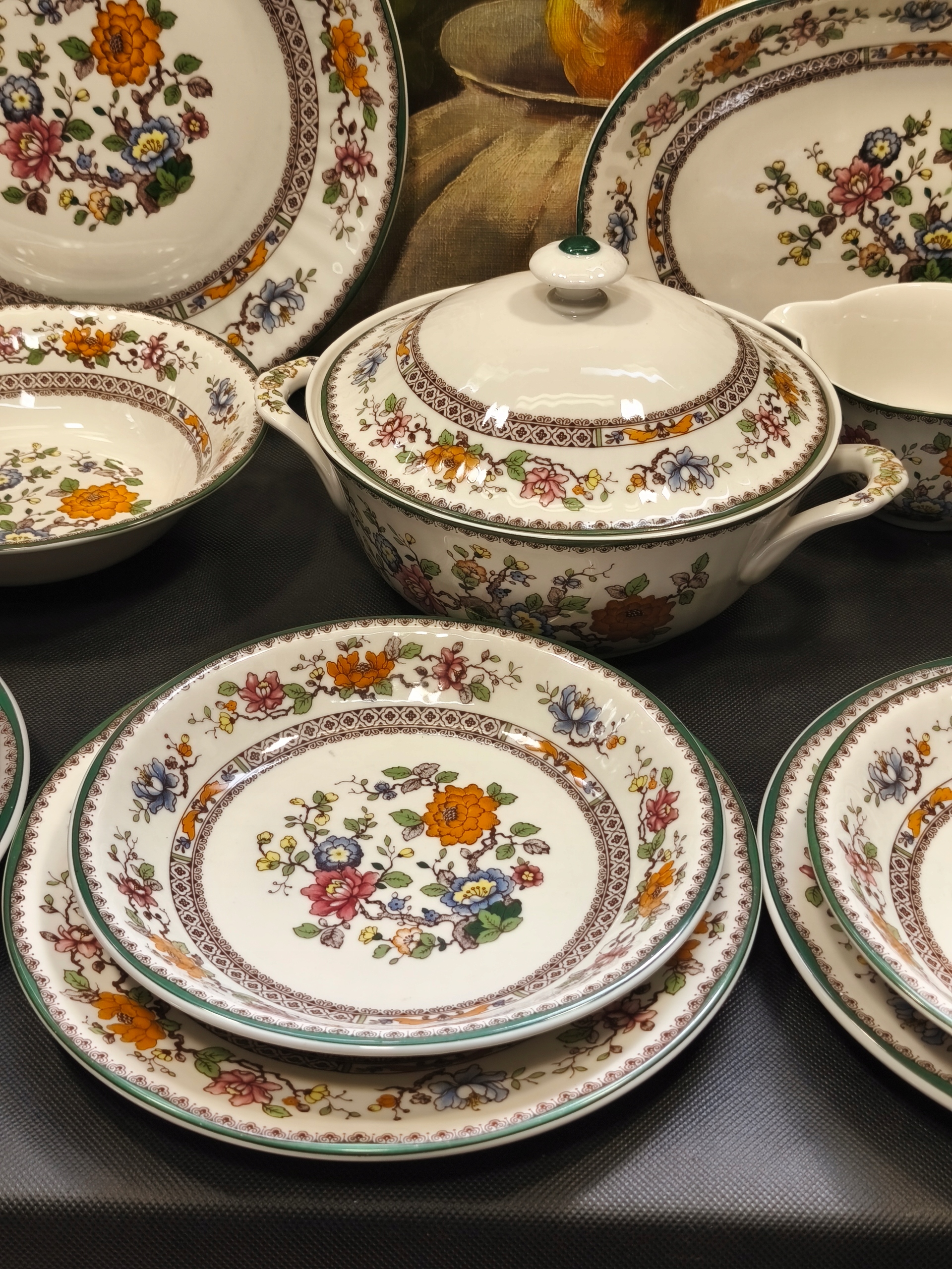Очень декоративная ручная обеда, заполненная для 9 человек с фарфоровой метки Eschenbach. Очень хорошее состояние без недостатков, без ругательства и изменений цвета. Используется в посудомоечной машине. Патера представляет собой патеру с диаметром 29 см, патера 31,5x21,5 см, чаша с диаметром 21,5 см и высотой 5,5 см, взвешивает ручки и крышку 15 см, 17 см, 19 см, 9 плоских пластин с диаметром 25 см и 9 глубоких платков с диаметром 21 см. Я рекомендую это. Также кофе в этом украшении.