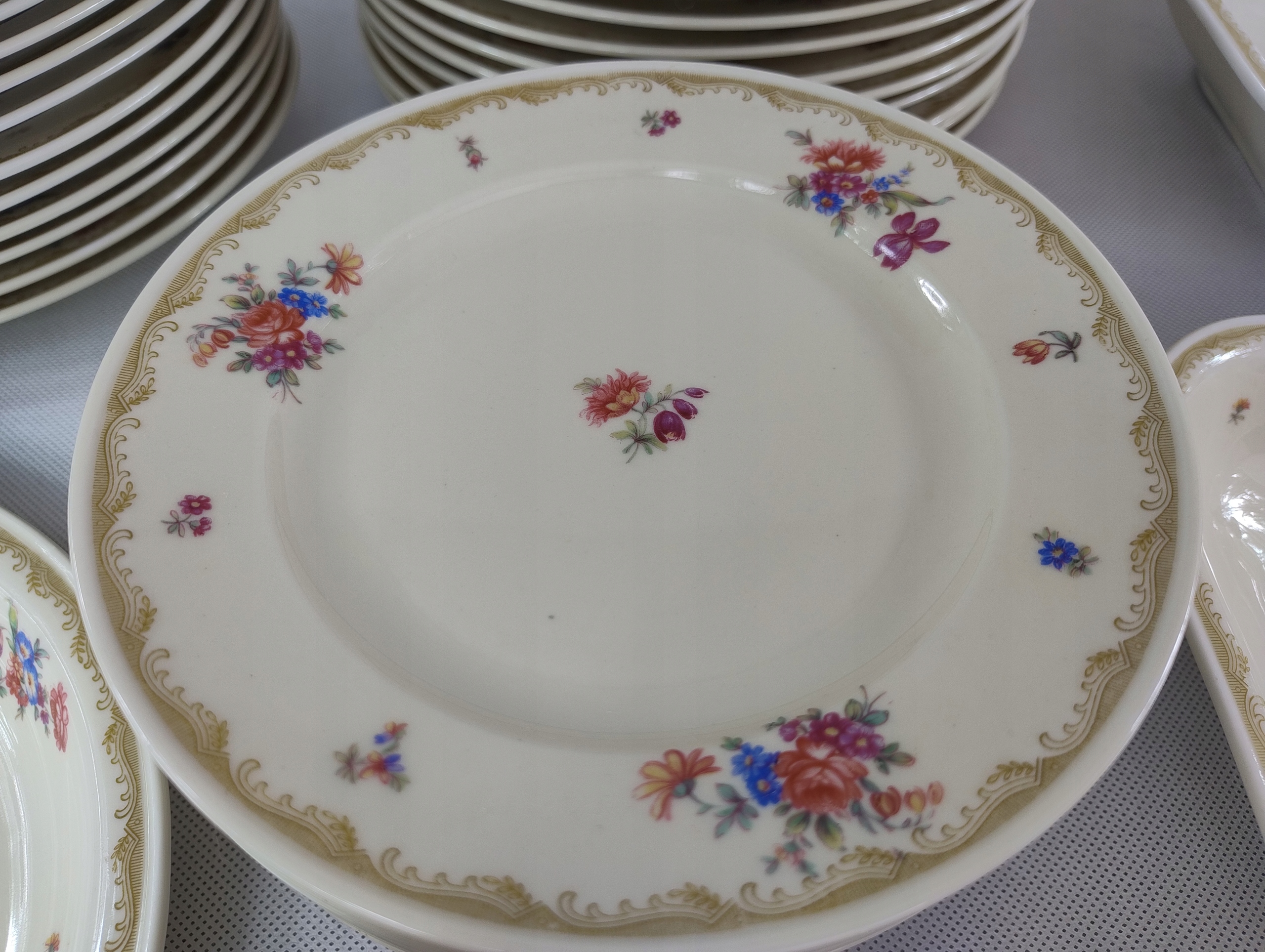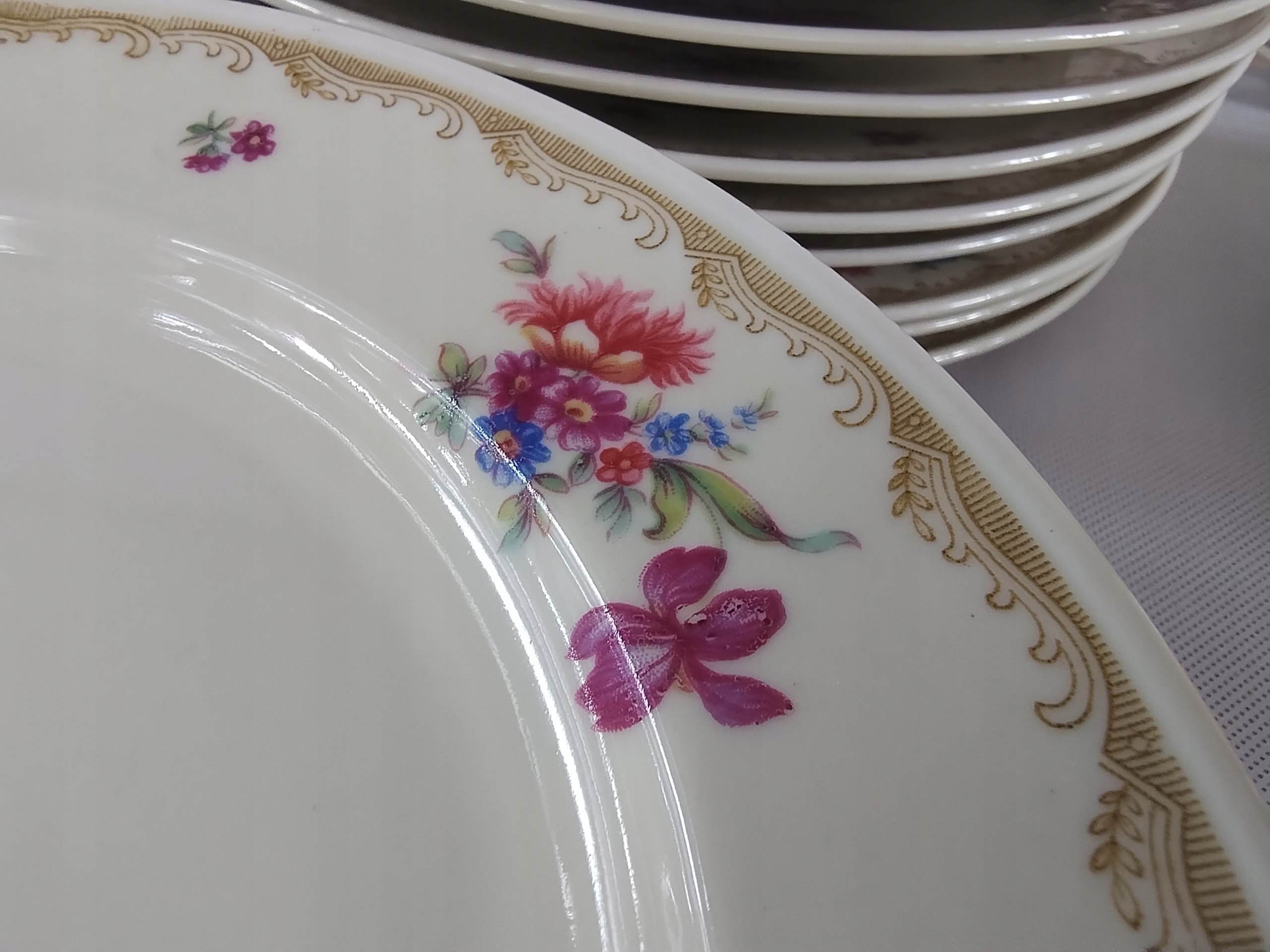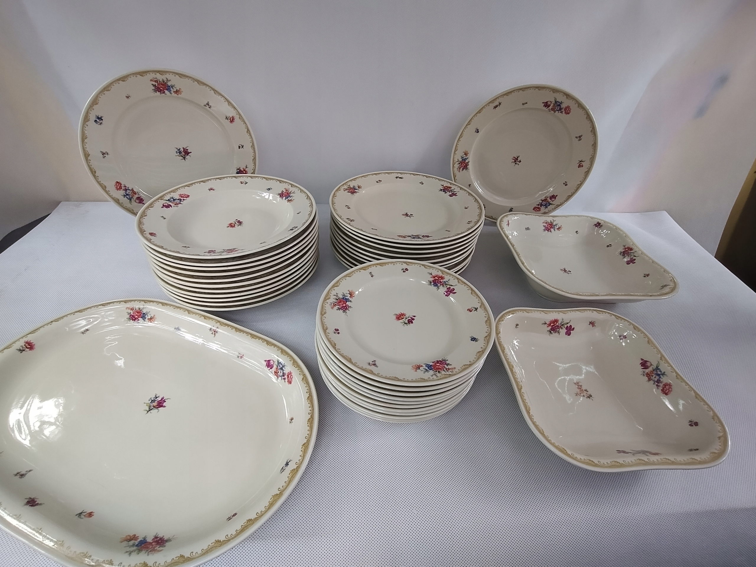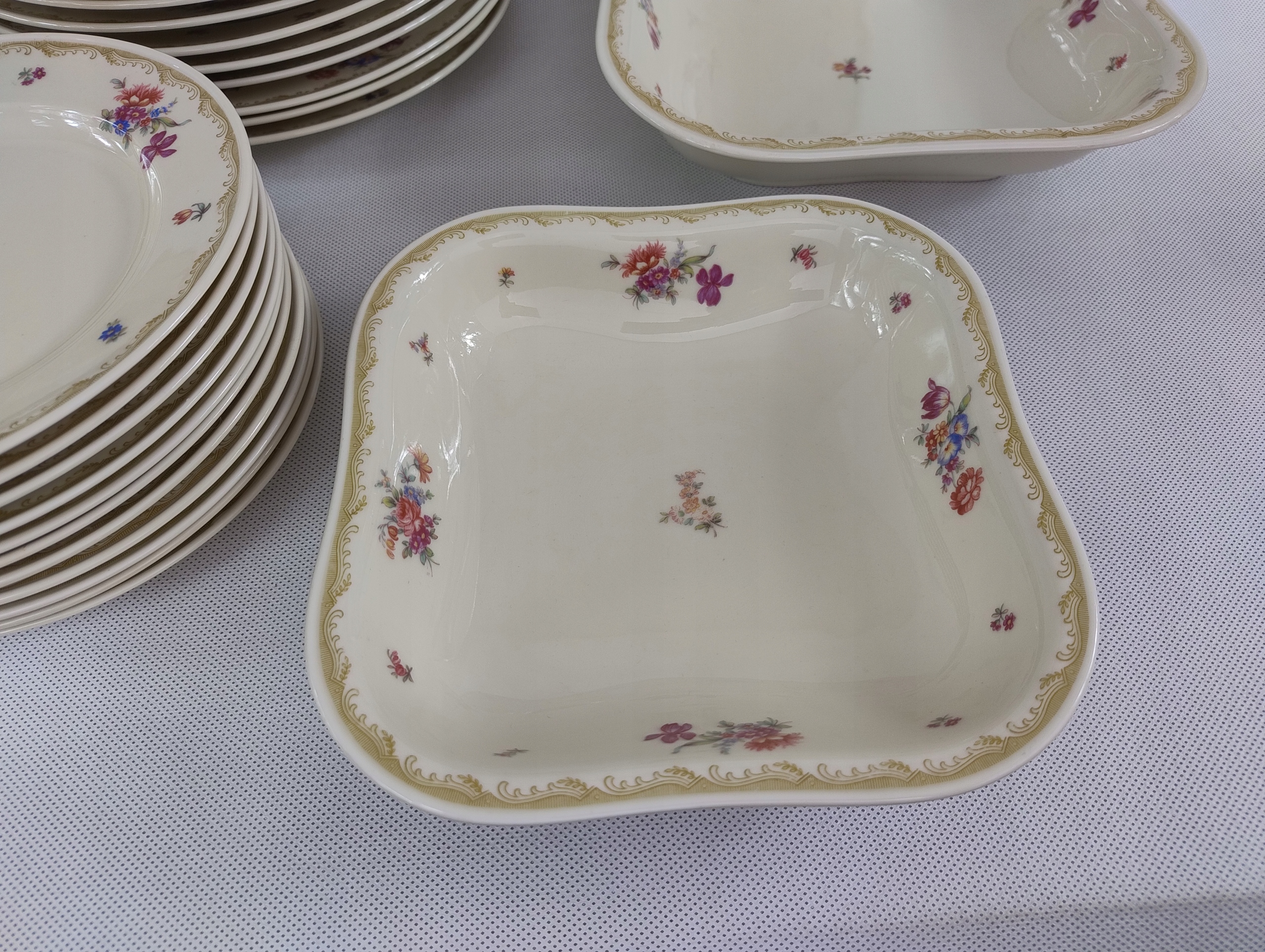 фарфор имеет элегантный цвет слоновой кости, украшенный нежным, красочным букетом цветов и золотым узором на границе. Состояние поведения очень хорошее, за исключением одного блюда, которое имеет небольшое обесцвечивание.