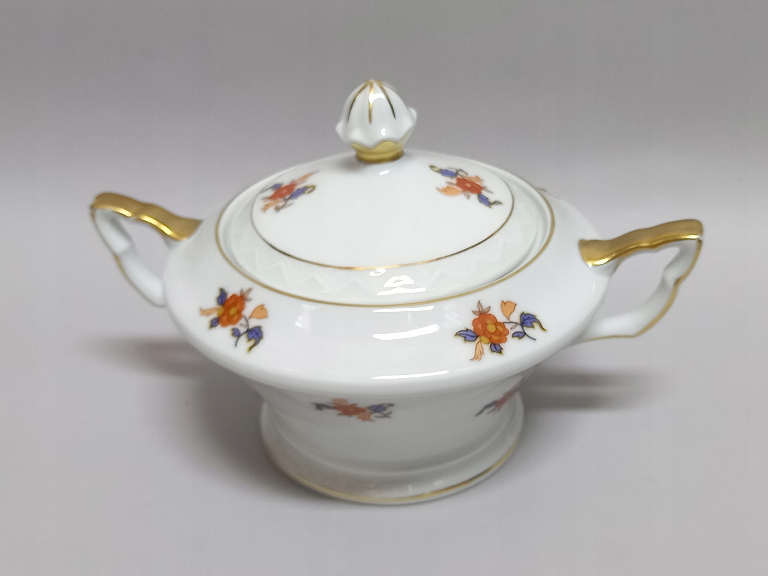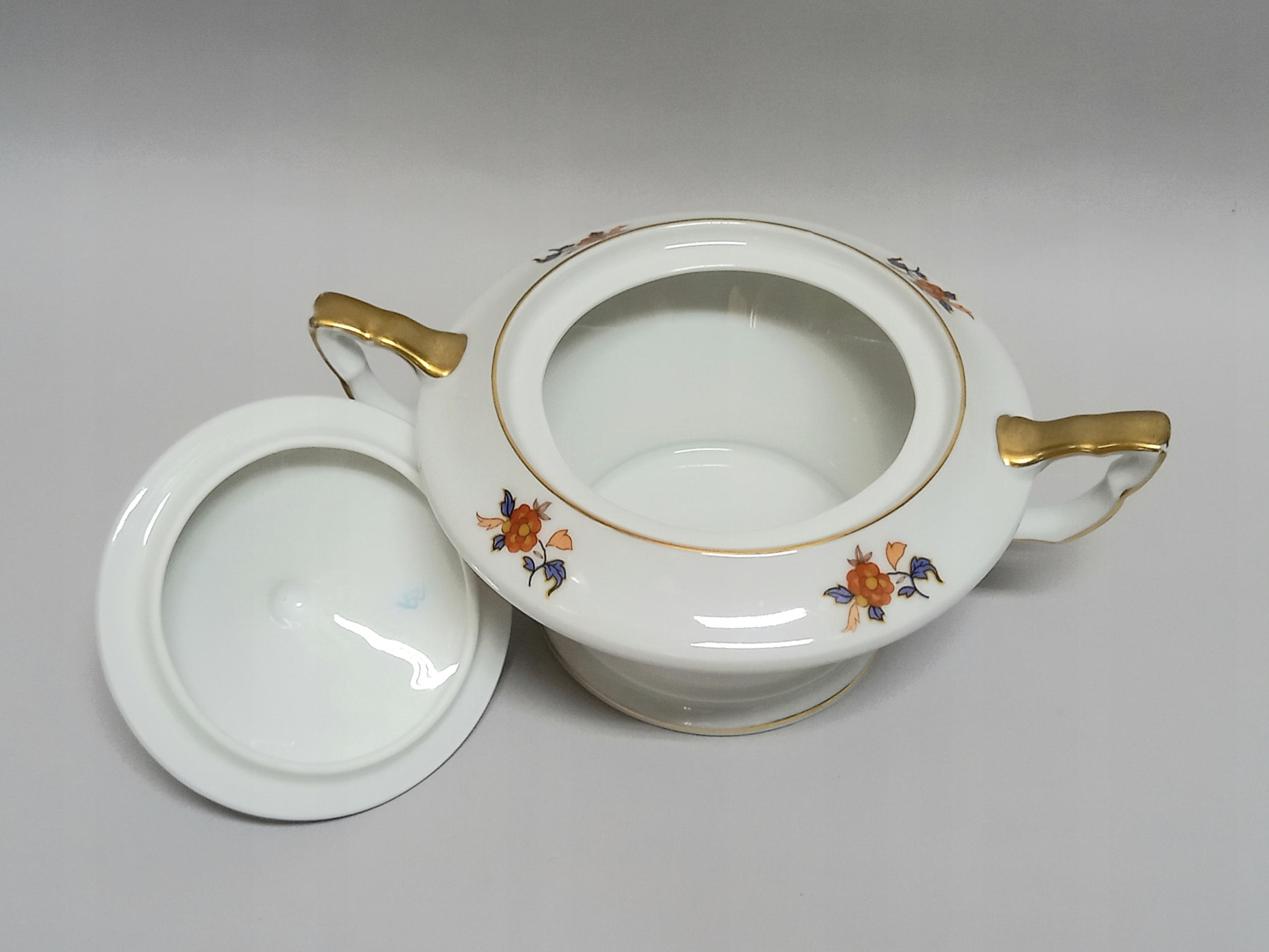 Снежный фарфор, украшенный тонким облегчением. Блюда с красивыми формами с характерными ручками. небольшой, красочный декор в стиле арт-деко был сделан с использованием техники Decalcillican. позолоченные края.