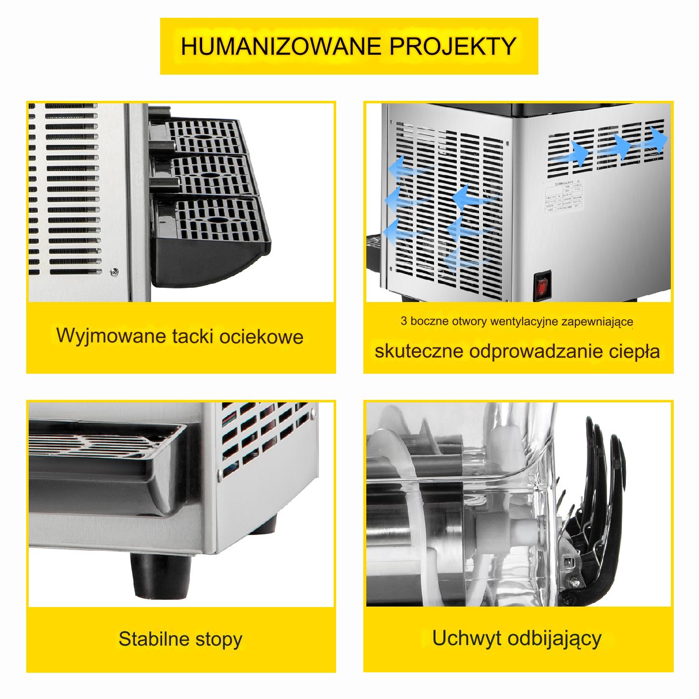 Машина оснащена съемными поддонами для чашек и стаканов, что помогает поддерживать порядок и чистоту. Краны большого диаметра облегчают быстрый разлив напитков, а большие вентиляционные отверстия и резиновые накладки под ножками повышают долговечность устройства.