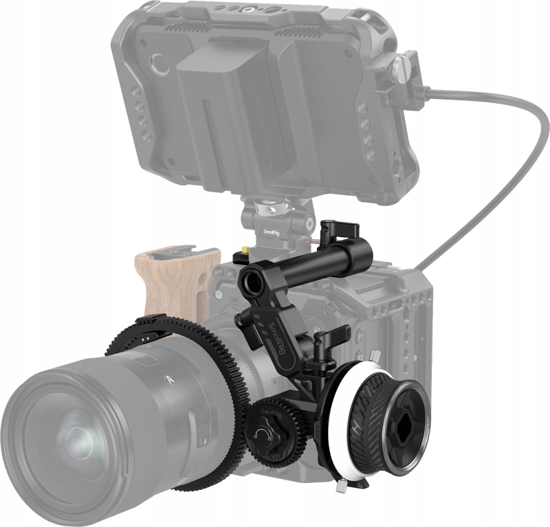 Он крепится к левой стороне объектива с помощью стержня SmallRig Φ15 мм 1050 и зажима стержня (с НАТО). рельс) 3011.