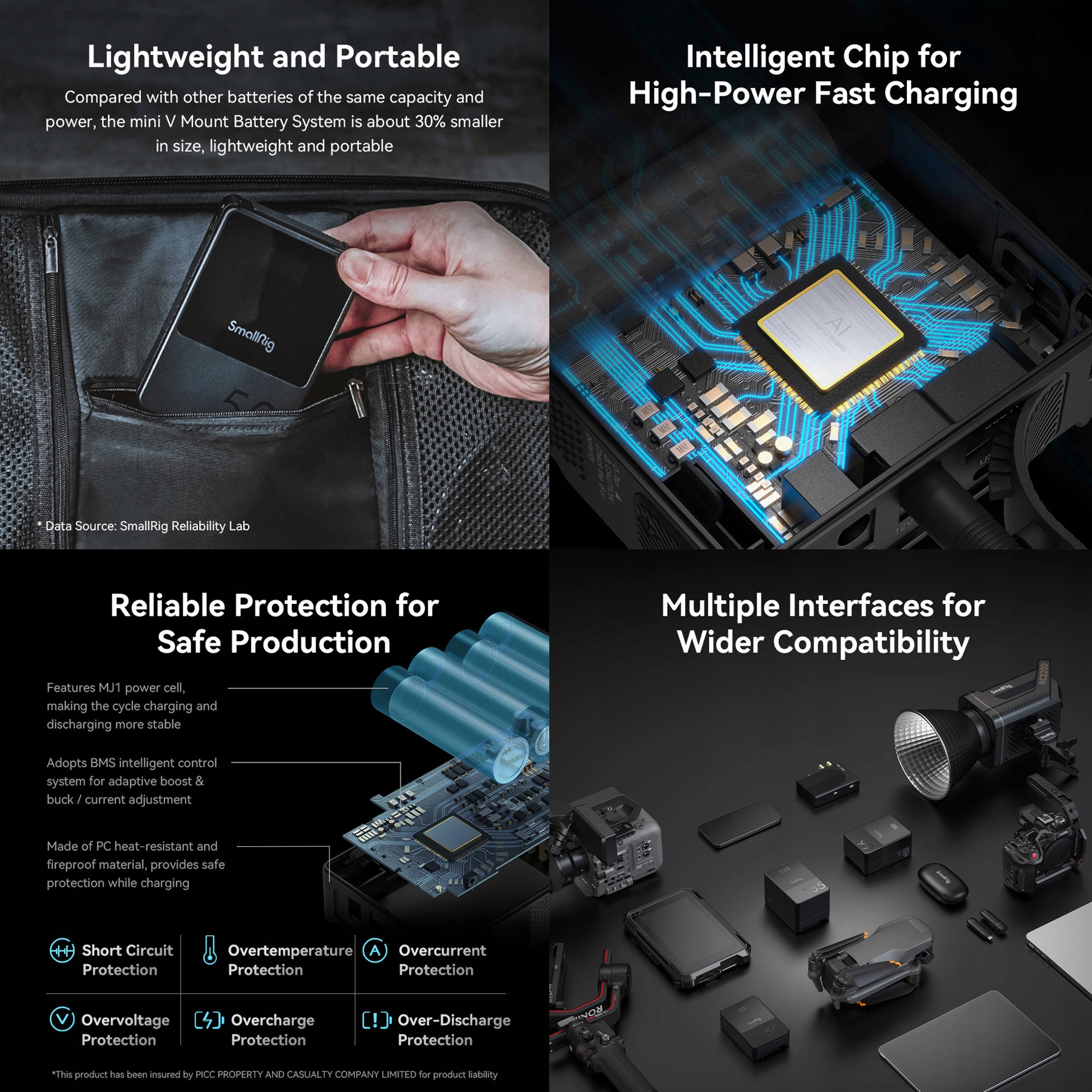 Примерно 70% размера обычного аккумулятора с V-образным креплением, учитывая его высокоинтегрированную конструкцию, которая занимает меньше места, что делает его легче и портативнее! Встроенный высокоинтегрированный чип BMS занимает меньше места, поддерживая различные протоколы быстрой зарядки и двунаправленную быструю зарядку USB-C PD мощностью 65 Вт (макс.)!
