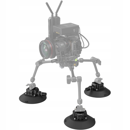 Большая кнопка насоса сбоку создает вакуумное давление для надежного захвата. Верхняя пластина имеет несколько монтажных резьб 1/4"-20 и 3/8"-16, а также противовращательное крепление в стиле ARRI 3/8"-16 для установки монтажного оборудования, волшебных рычагов и головок камеры. В комплект входит пылезащитный чехол, защищающий присоску во время хранения.