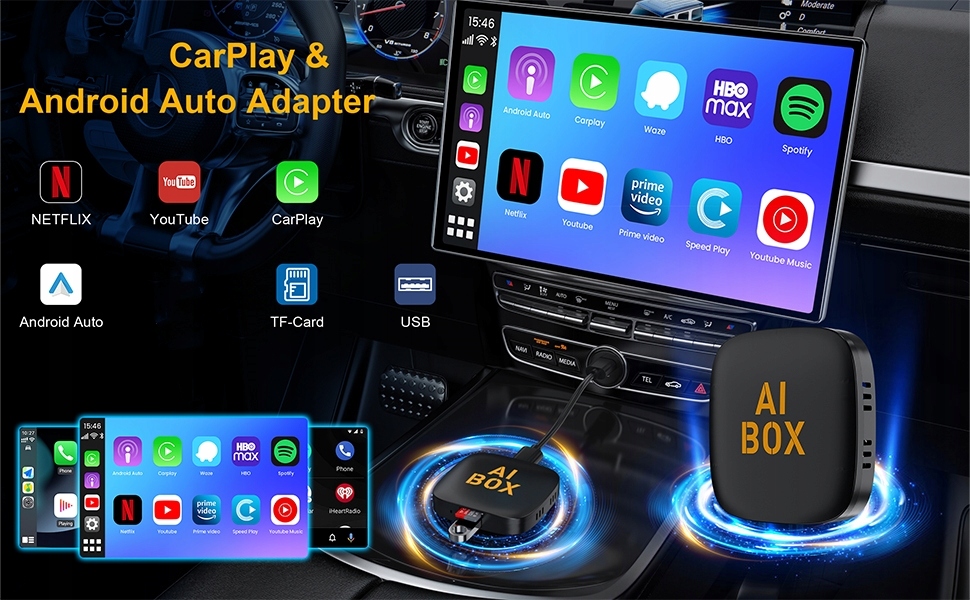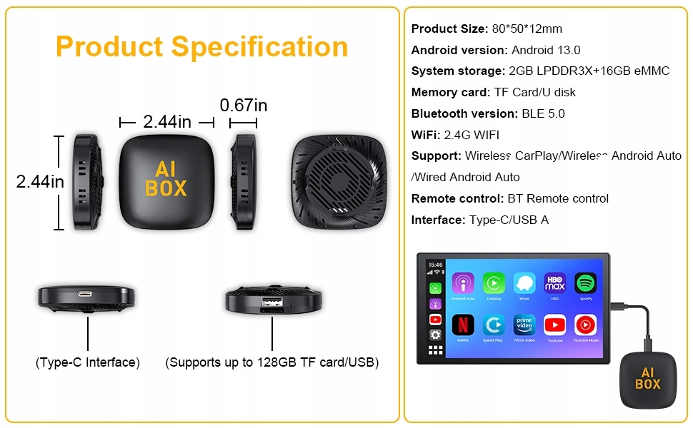 ТВ-приставка Android 13 Smart CarPlay Ai Box Wi-Fi Беспроводной Android Auto Встроенный магазин Play Store для автомобилей YouTube Netflix OEM CarPlay