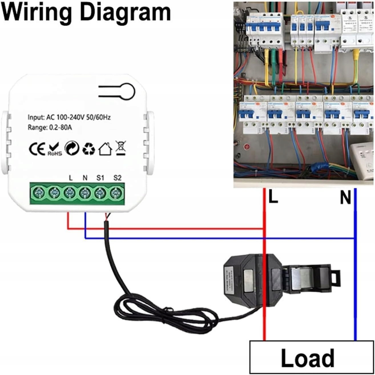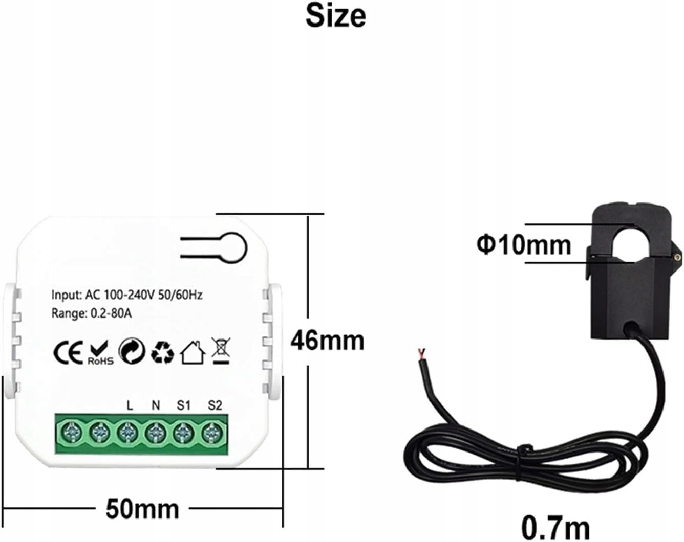 Конструкция на основе взаимной индуктивности с клеммой трансформатора тока для удобного самостоятельного монтажа. Питание осуществляется от сети переменного тока (110-240 В). Устройство не питается от батареи и не работает только от зажима — рекомендуется иметь базовые знания по электробезопасности. - 3️⃣ Совместимые размеры зажимов трансформатора тока