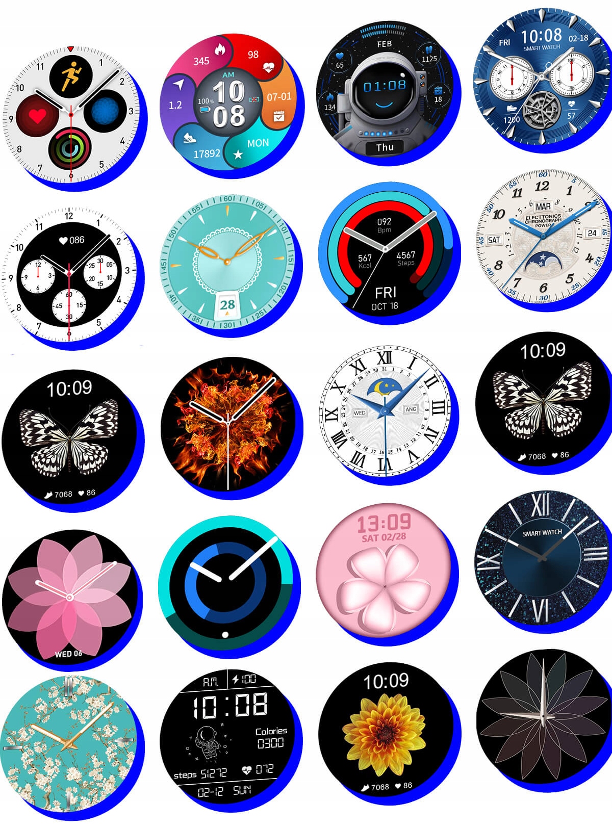 ЧАСЫ ИМЕЮТ 17 ОСНОВНЫХ ЦИФЕРБЛАТОВ. ОСТАЛЬНОЕ ВЫ ЗАГРУЖАЕТЕ ЧЕРЕЗ ПРИЛОЖЕНИЕ. ВЫ ТАКЖЕ МОЖЕТЕ СОЗДАТЬ СВОЙ ЩИТ ИЗ ФОТО, НАПРИМЕР. ЛЮБИМЫЙ ЧЕЛОВЕК ИЛИ ЖИВОТНОЕ :) ОТДЕЛЬНЫЕ ЦИФЕРЫ ДОПОЛНИТЕЛЬНО АНИМИРОВАНЫ (НАПРИМЕР, БАБОЧКА, ДВИГАЮЩАЯ КРЫЛЬЯМИ)