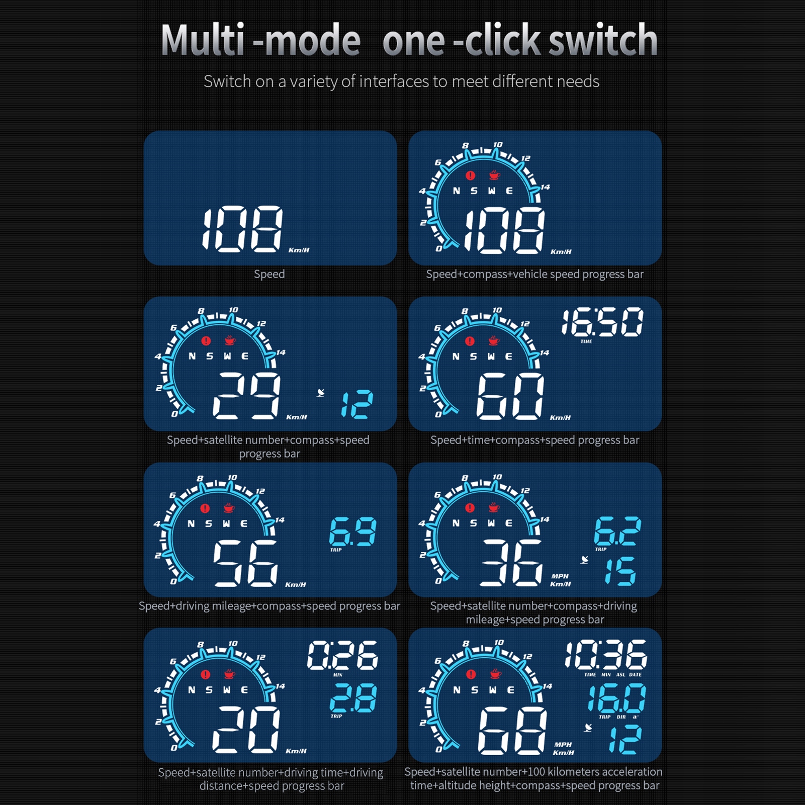 2. Многофункциональный дисплей: дисплей на голове имеет много функций отображения, включая скорость, панель хода скорости, направление вождения, время вождения, часы, высота и другую информацию, которые отвечают потребностям водителей.