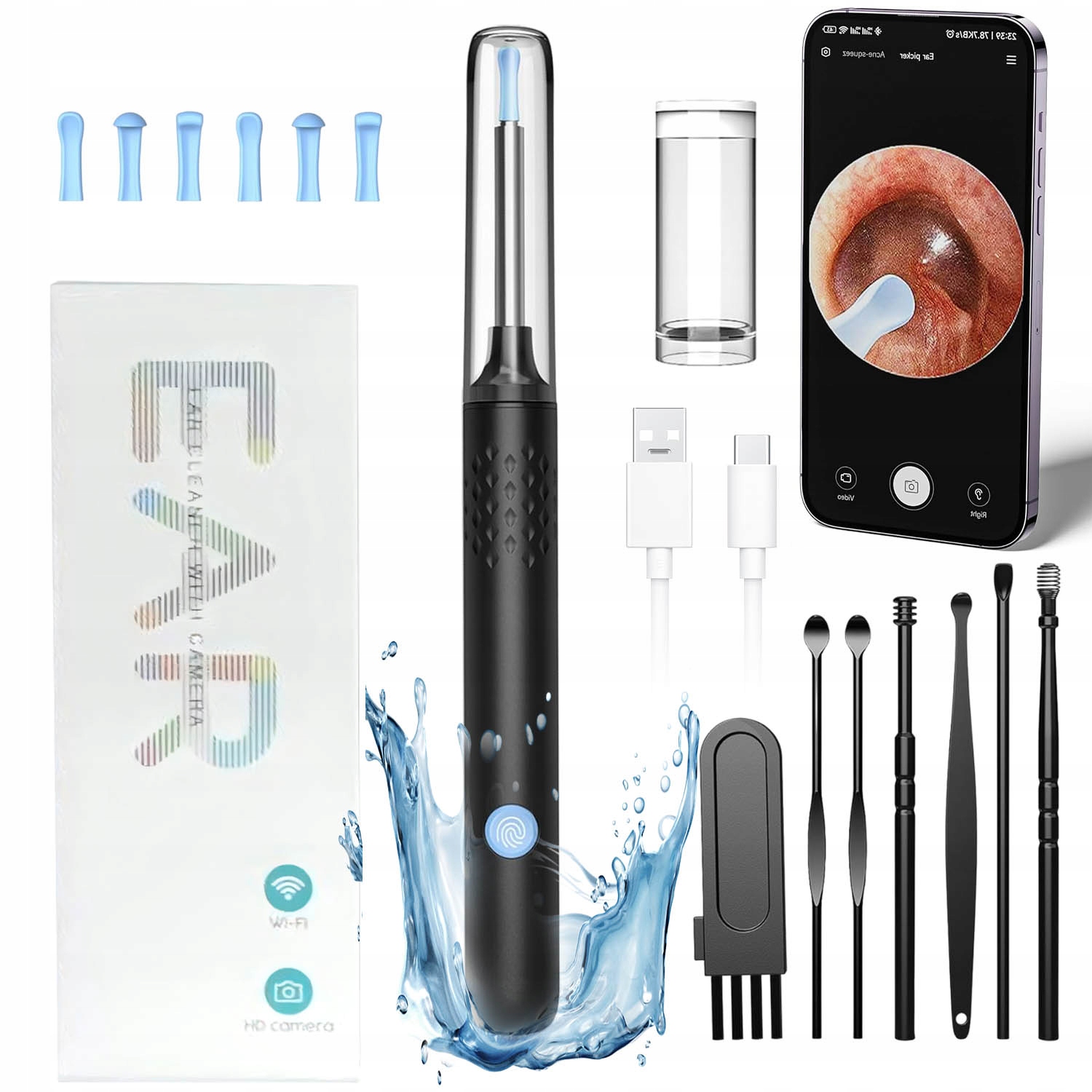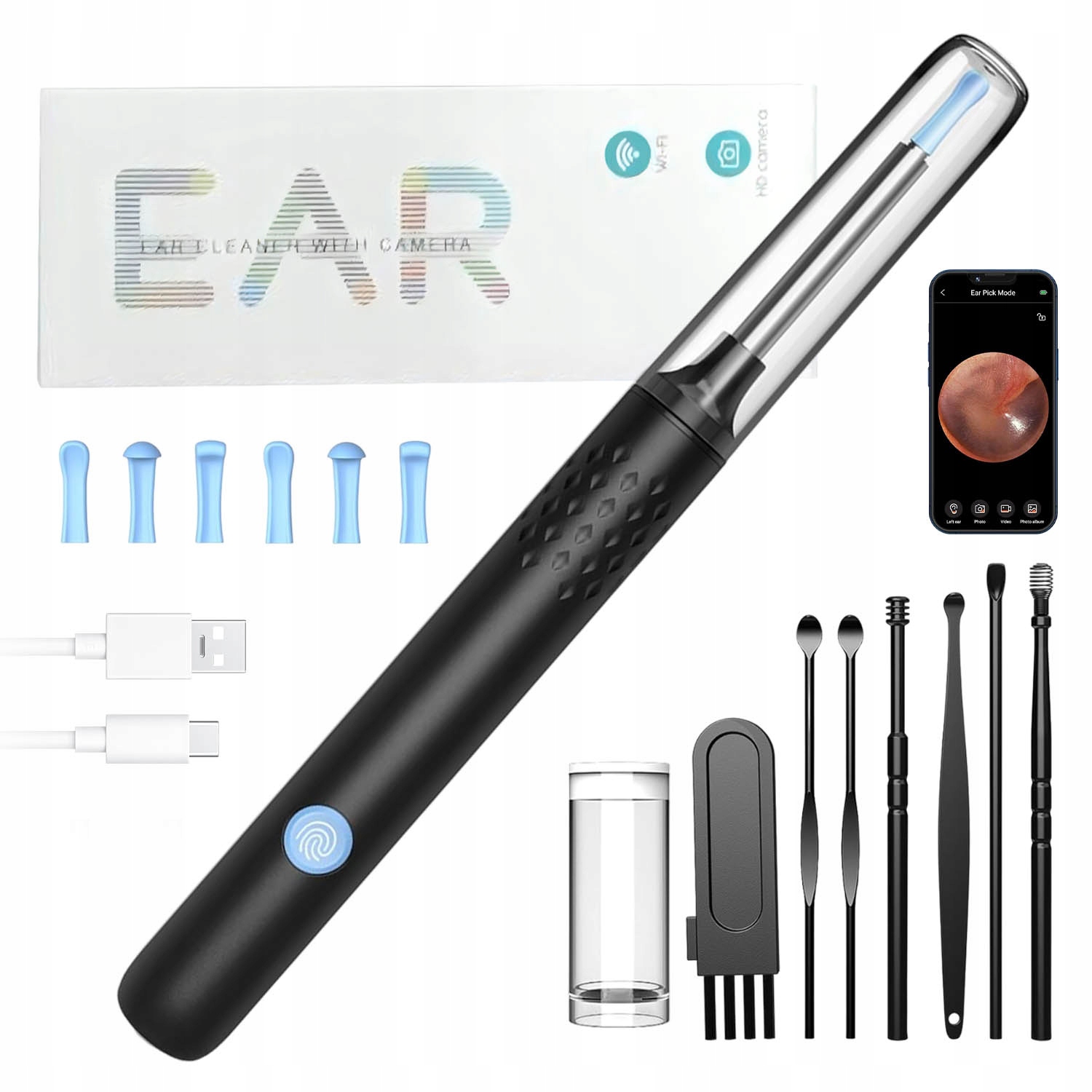 Камера для чистки ушей интегрирована с портативным USB-кабелем, длительное время работы в режиме ожидания после зарядки, легко носить с собой. В комплект также входит набор для чистки ушей из 7 предметов, который можно взять с собой и чистить уши вместе. После очистки ушной серы ее можно протереть водой или спиртовой салфеткой, что является чистым и гигиеничным.