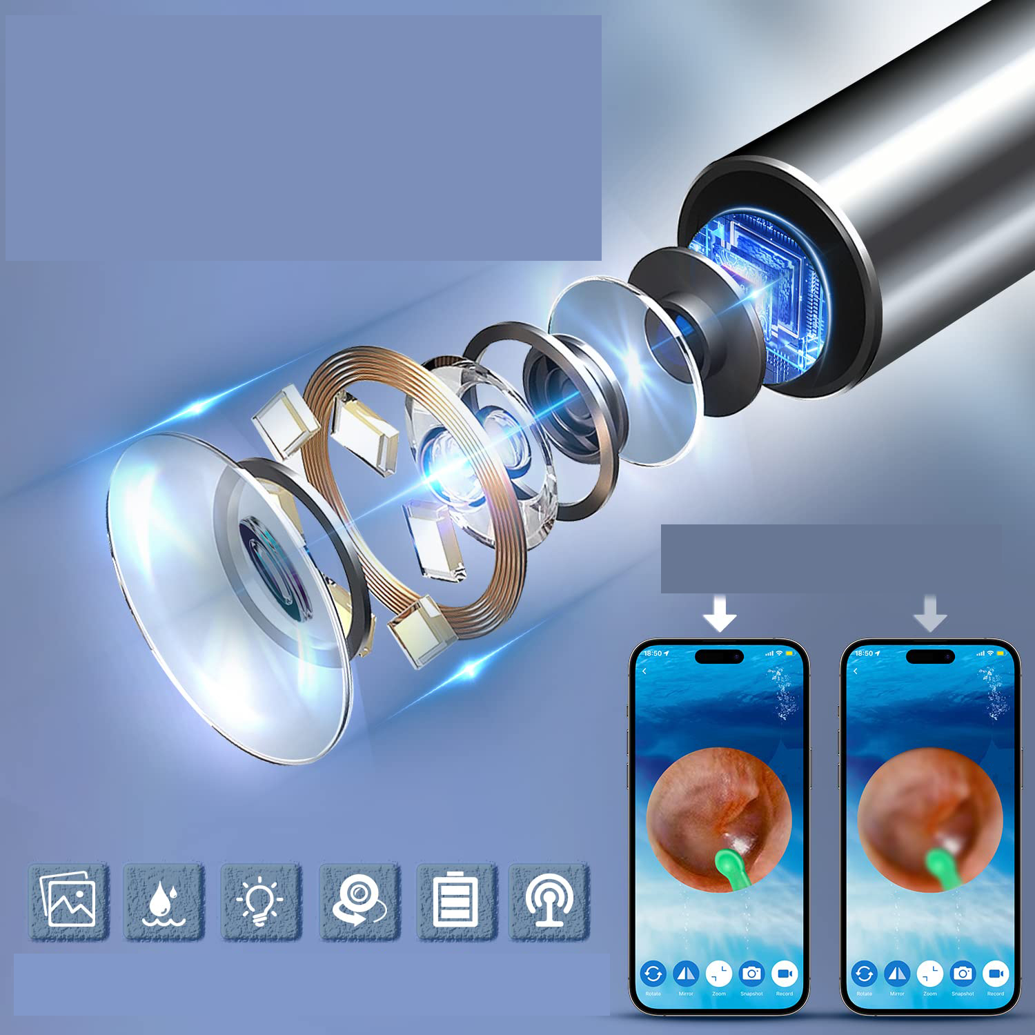 Ушные камеры HD 1296P: Этот инструмент для удаления ушной серы включает в себя камеру 1296P, 3M пикселей с объективом 180° и 6 термостатическими светодиодами. Благодаря функциям зеркала вы можете делать фотографии и записывать HD-видео в реальном времени с широким углом обзора.
