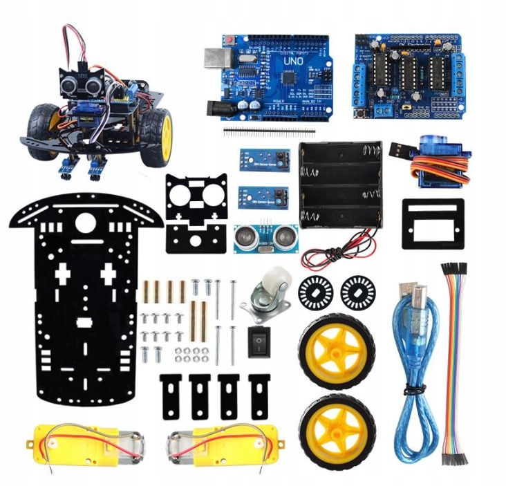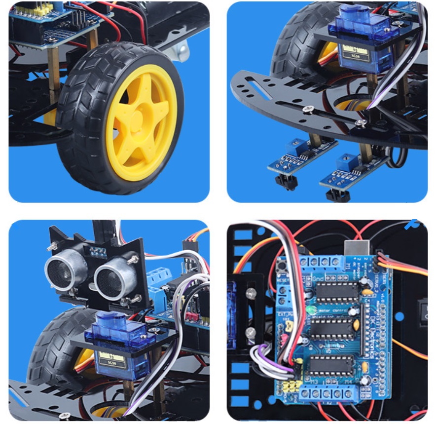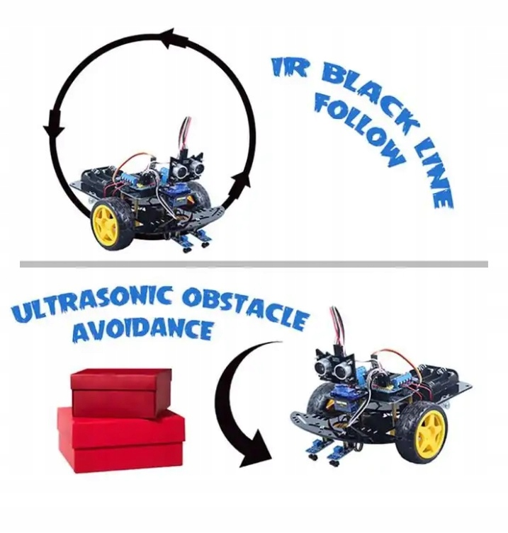 Модуль ультразвукового датчика удерживает машину от препятствий. Два инфракрасных модуля отслеживания позволяют функцию отслеживания линии.