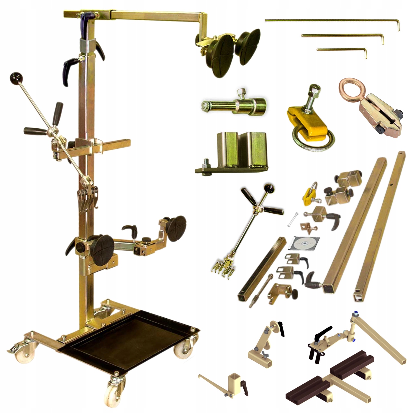 - ✔️ Быстрое выпрямление бокового корпуса (и не только) вблизи места ремонта, это Основой является вертикальная балка, оснащенная передвижной тележкой с регулируемыми резиновыми кронштейнами, поддерживаемыми усиленными элементами кузова. Затем вмятину извлекают с помощью винта, направленного на место ремонта.