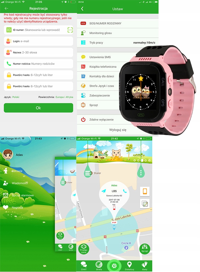 Графическое меню часов выполнено в виде крупных иконок с короткими фразами на польском языке. (например, камера, фотографии, телефонная книга), поэтому даже маленькие дети смогут легко ими пользоваться.
