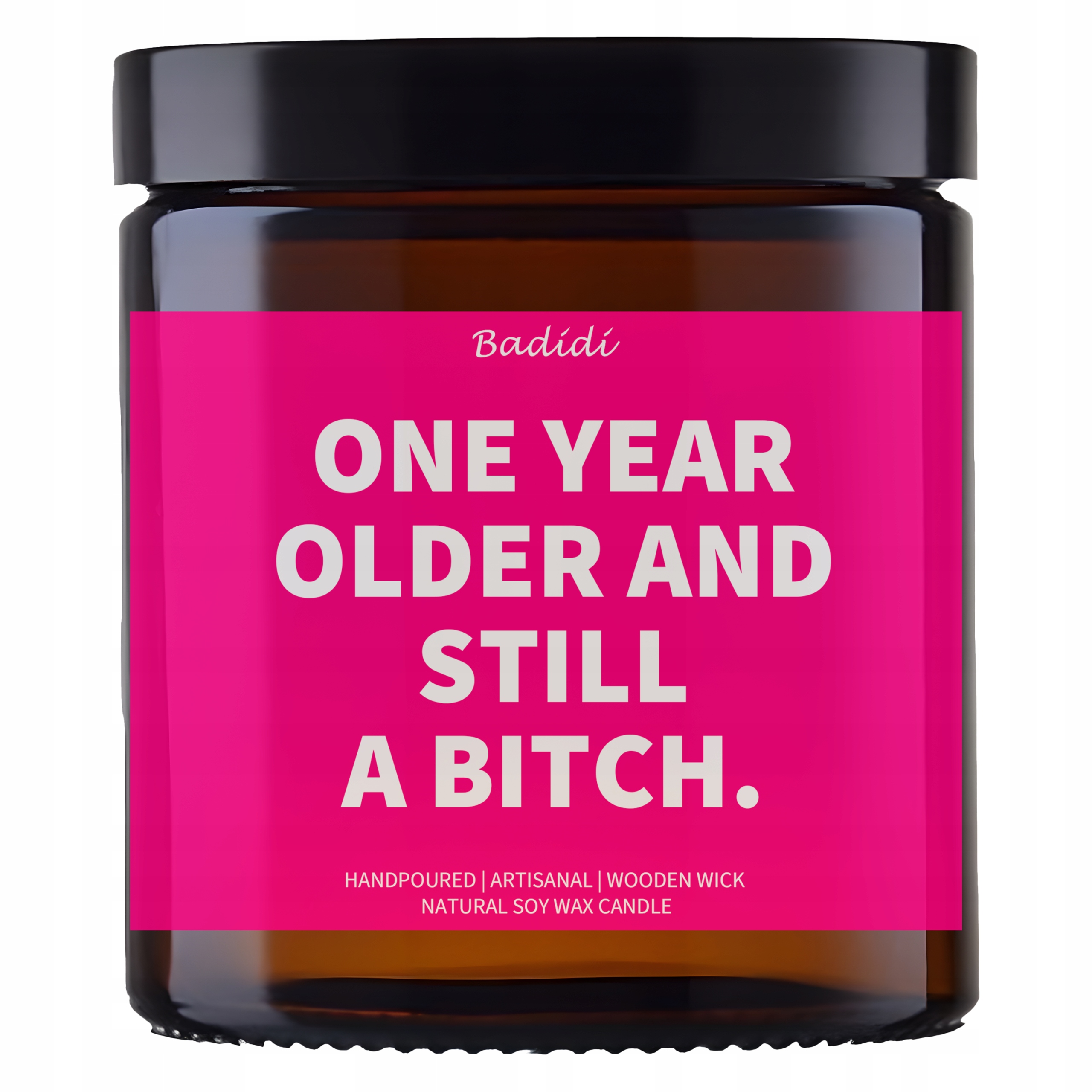Ароматическая свеча с забавной надписью "СТАРЕШЕ НА ГОД, А ЕЩЕ СУКА" – отличный подарок на день рождения себе или близкому человеку, жене, другу или коллеге.
