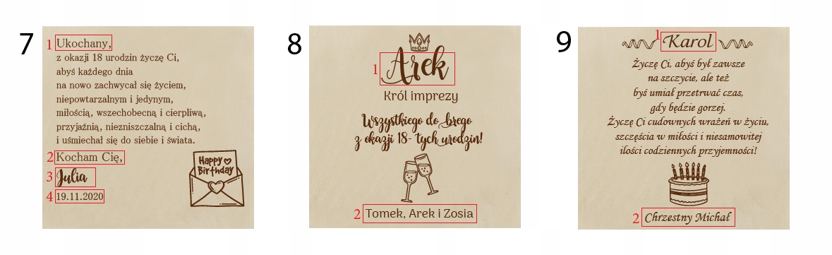 После совершения покупки не забудьте отправить информацию с текстом персонализации.* Красный кадр отмечен местом, подлежащим изменениям.
