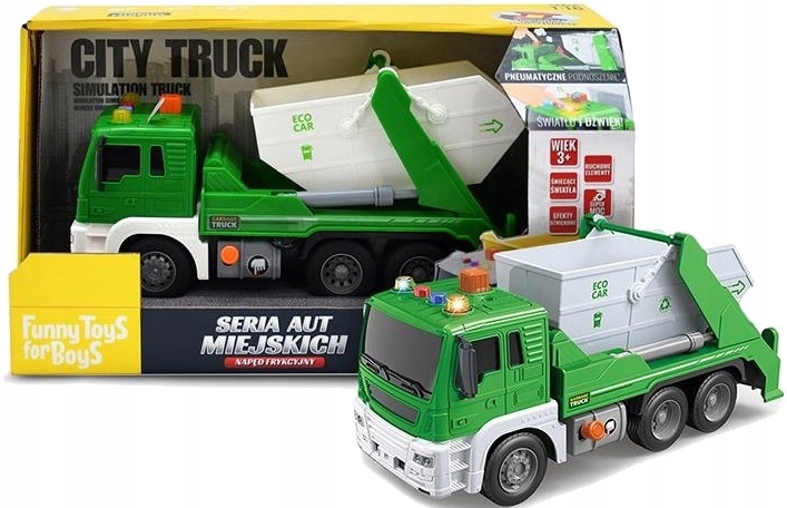 Грузовик, муниципальный автомобиль с контейнером, свет. Надежно, когда играет в городе!