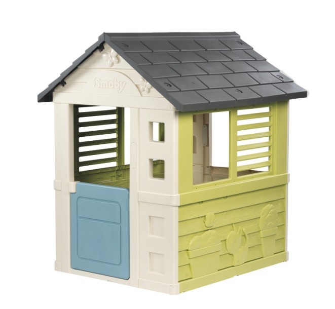 Дом с двумя окнами, у которых есть жалюзи, оригинальный внешний вид благодаря изображениям животных на стенах. 48% пластикового дома, используемого для производства, поступает из переработанного. Устойчивая и стабильная конструкция. Анти-UP покрытие, защищающее от увядающих цветов на солнце. Высота: 127 см. Размеры: 98 x 110 x 127 см, произведенные во Франции.