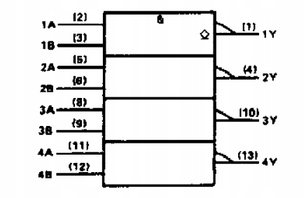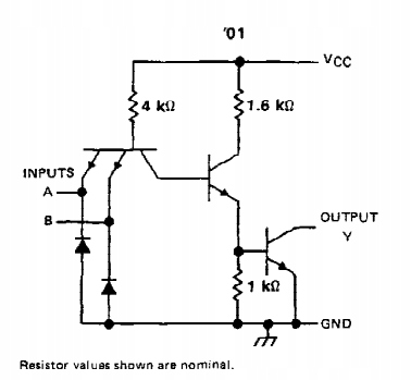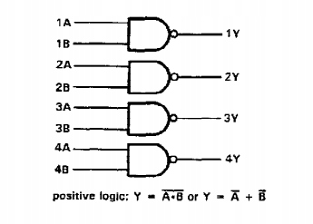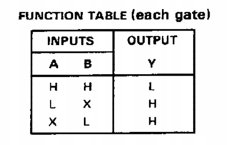 Структура системы содержит 4 двухвходовых логических элемента, реализующих функцию И-НЕ. Эти ворота оснащены универсальными выходами OC. Однако для правильной работы они требуют использования подтягивающего резистора. Выход с открытым коллектором обеспечивает гораздо более высокие выходные напряжения и более высокие выходные токи.