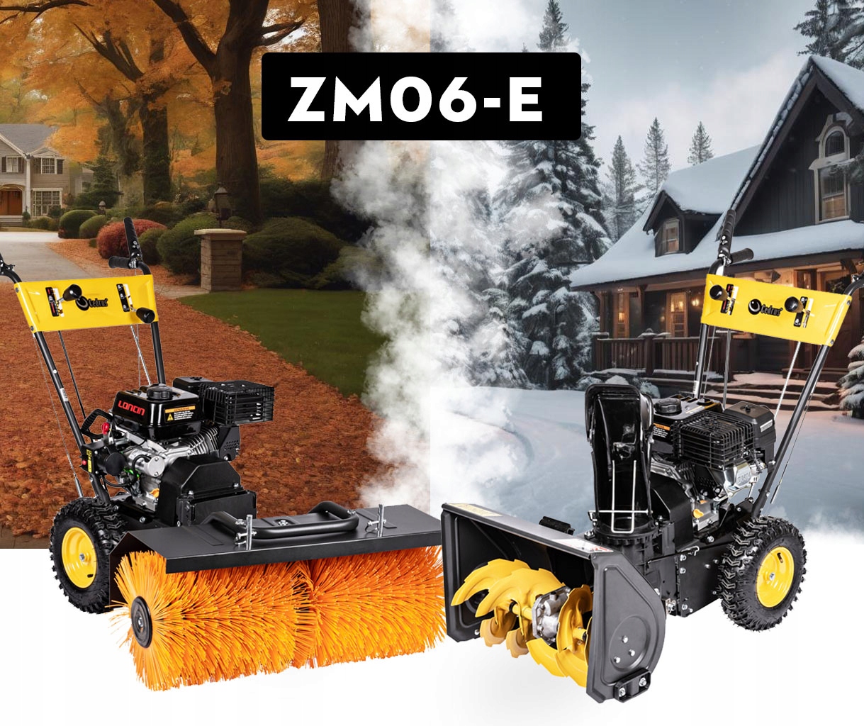 Бензиновый снегоочиститель/подметальная машина Cedrus ZM06E 4в1 является универсальным Устройство стандартно оснащено множеством аксессуаров. В комплект входит подметальная машина шириной 80 см, оснащенная двигателем Loncin G200F с электрозапуском (двигатель необходимо подключить к розетке 230 В и запустить с помощью кнопки), отвал для уборки снега, контейнер для сметаемых отходов и роторный плуг – двухступенчатый снегоуборщик с регулируемым вручную дефлектором. Преобразовать подметальную машину в снегоочиститель легко с помощью быстроразъемного соединения.