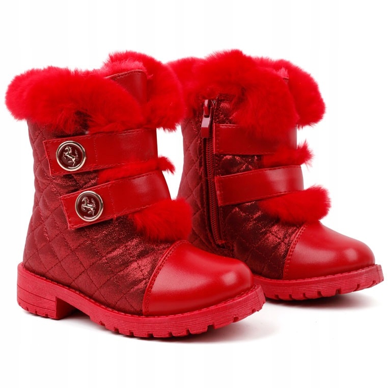 Сапоги для девочек, установленные на плоской подошве с протектором. Нос округлен. Верхняя часть достигает лодыжки. Сделано из Eco -Leather в связи со слегка блестящим материалом. Верхняя часть верхней и языка уменьшает вставки мягкого имитационного меха. Они прикреплены двумя липучками, в дополнение к внутренней части ползунка. Модель сильно изолирована. Им понравится каждая маленькая леди!