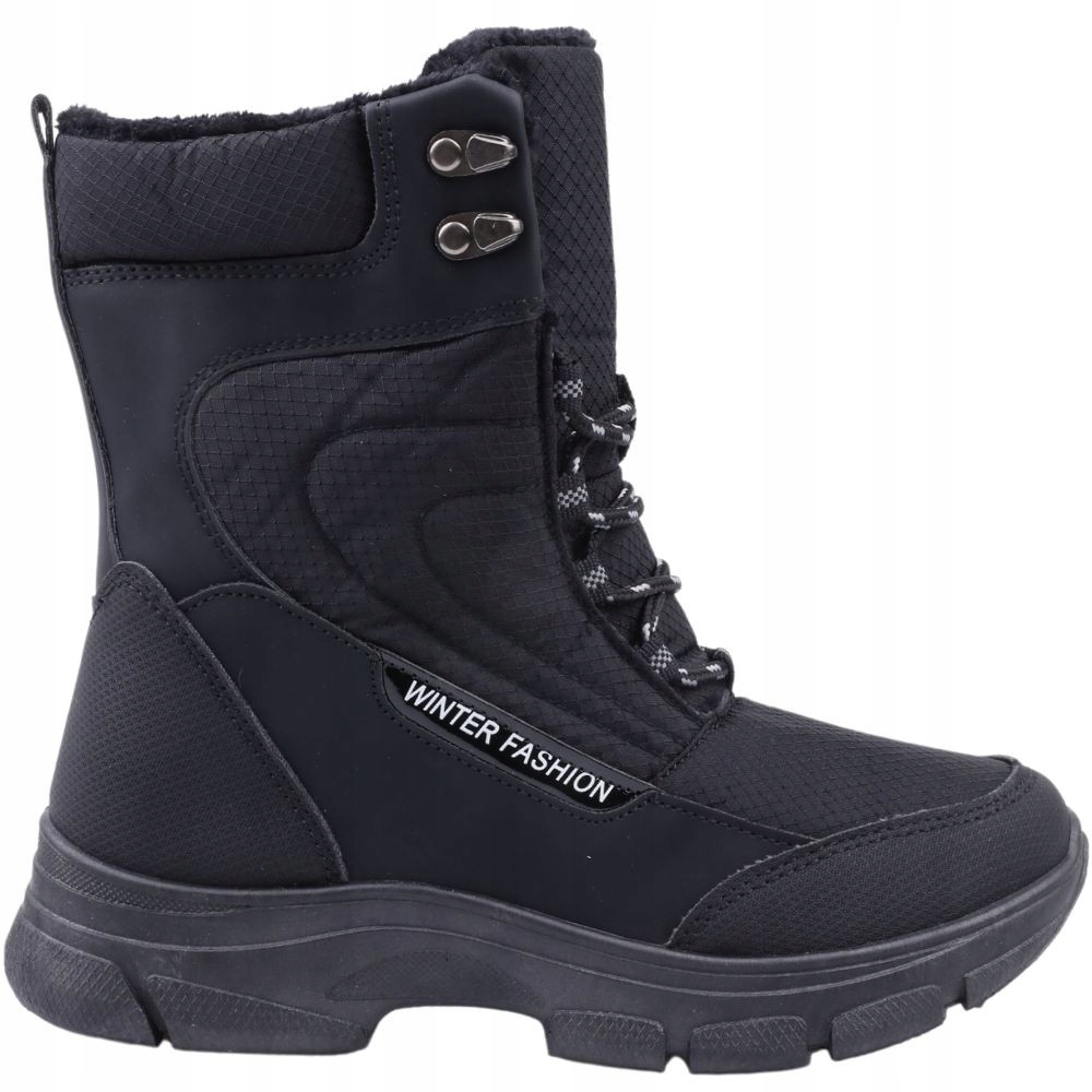 Женские зимние ботинки спортивного кроя. Круглый нос. Высокий, неровный верх выше щиколотки, с декоративной надписью. Зимний внешний материал с повышенной устойчивостью к намоканию. Толстая, но легкая подошва из пеноматериала обеспечивает хорошую защиту от холода. Спереди застежка, а внутри дополнительная молния. Утеплен материалом, имитирующим флис.