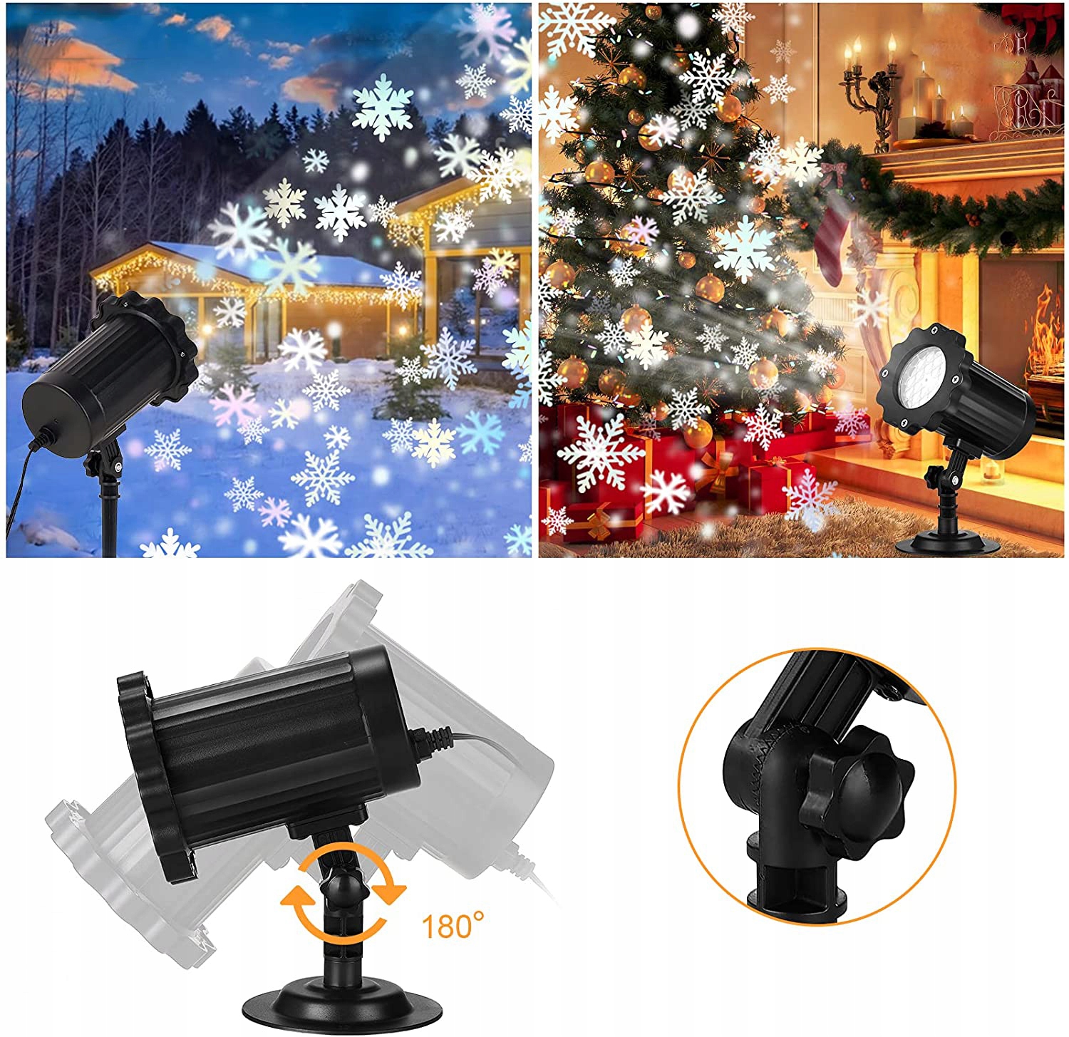 - Проектор снежинок оснащен высококачественными светодиодами, расстояние проецирования может достигать 20 м и 36 полупроницаемых отверстий придают проецируемым снежинкам 3D-эффект.