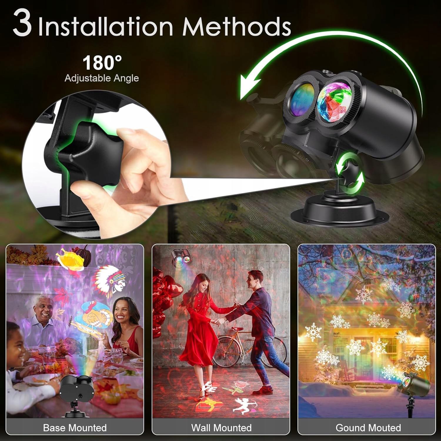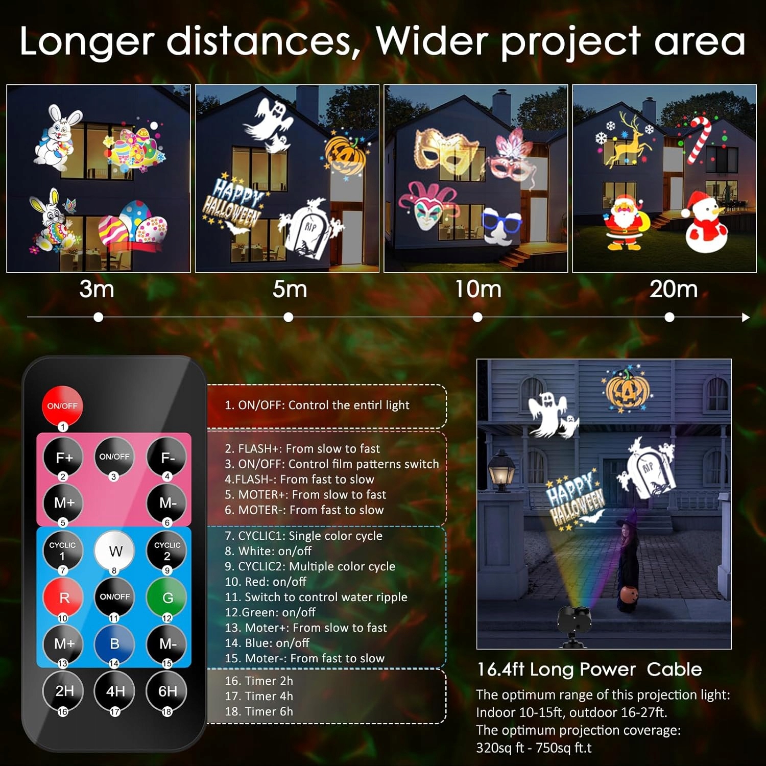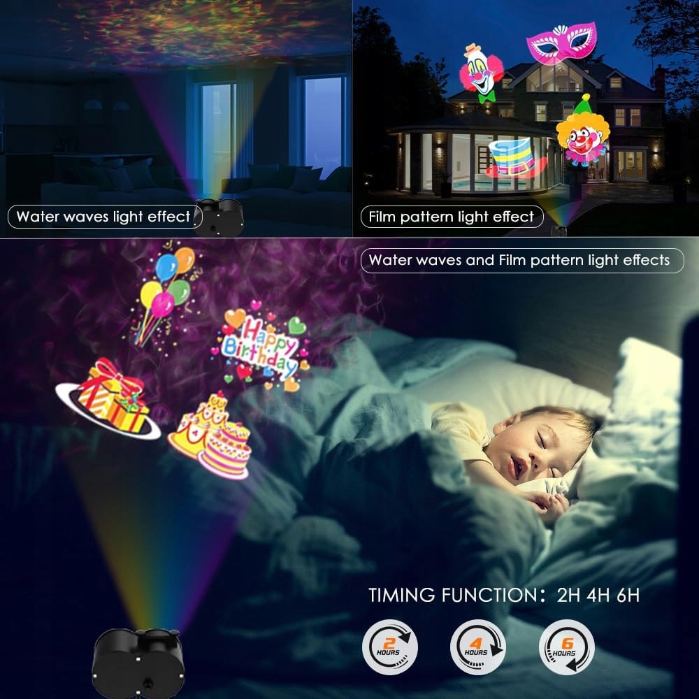- 2 проекционные головки, одна для 10 цветов с эффектом водной волны, другая проекционная головка может переключаться на 16 шаблонов, включая Рождество, Хэллоуин, снежинки, праздничный торт, фейерверки и многое другое.