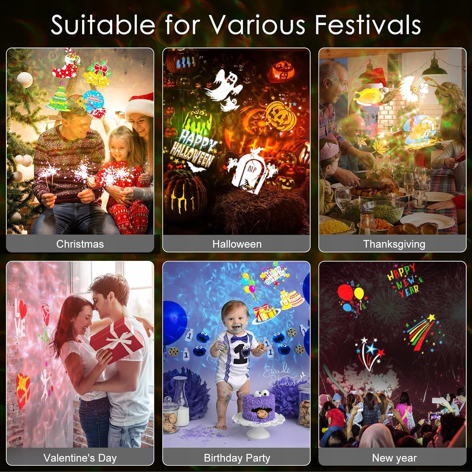 Вы можете использовать пульт дистанционного управления, чтобы свободно переключать желаемый эффект. Небольшой проектор может создать интересную атмосферу на любом фестивале круглый год.