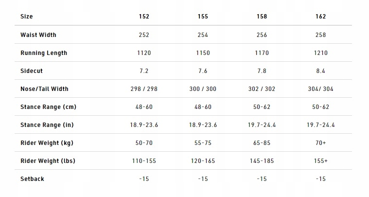 - Вес райдера: 152/50-70 кг; 155/55-75кг; 158/65-85 кг.