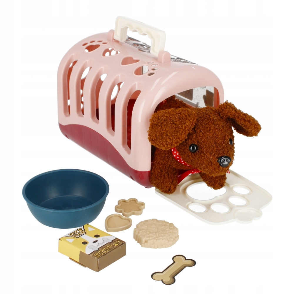 СОБАКА ПЛЮШЕВА ІГРАШКА З ТРАНСПОРТЕЖОМ + АКСЕСУАРИ НАБІР ХАРЧУВАННЯ
