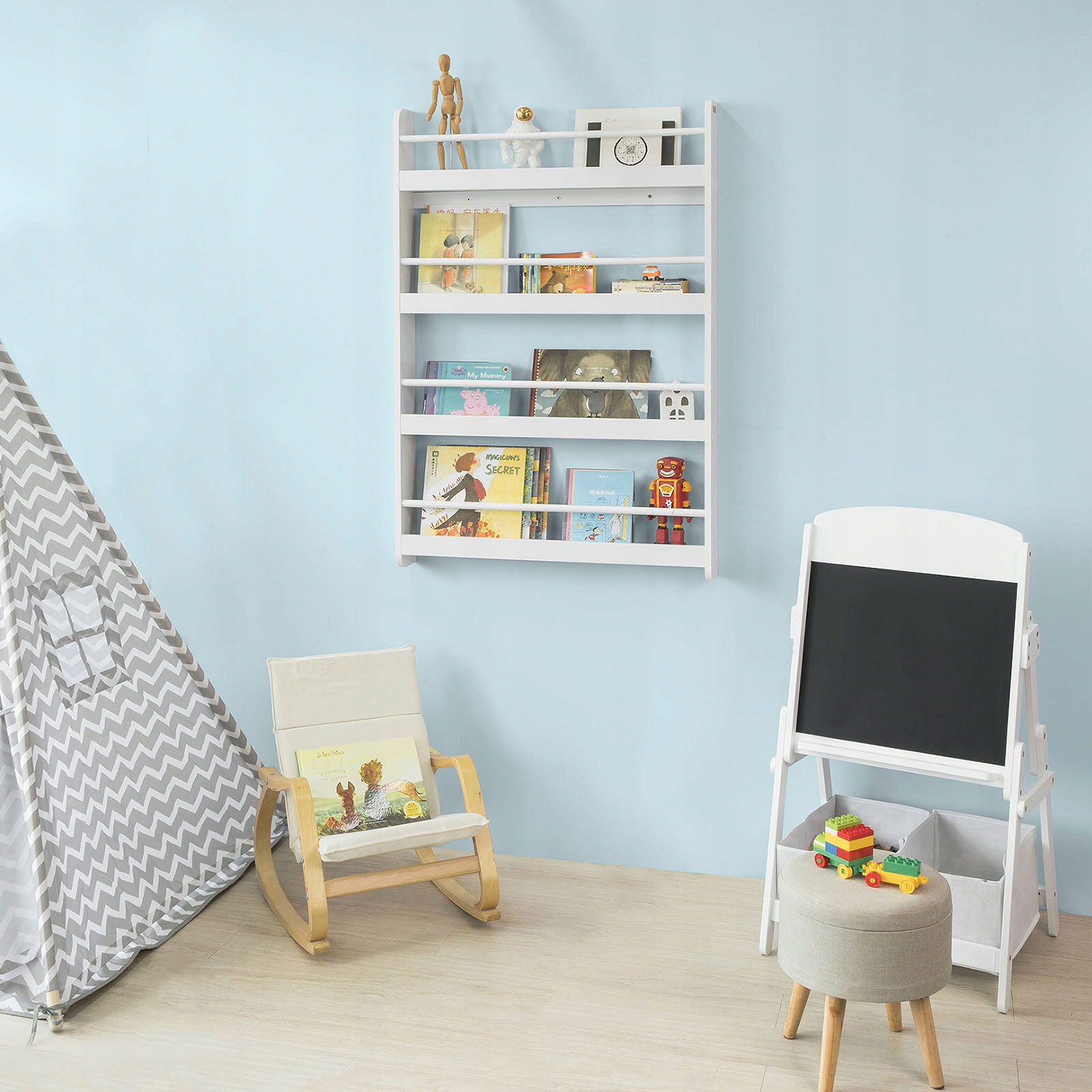Его можно прикрепить к стене на любой высоте, благодаря чему ваш ребенок если она сможет самостоятельно дотянуться до любимых книг.