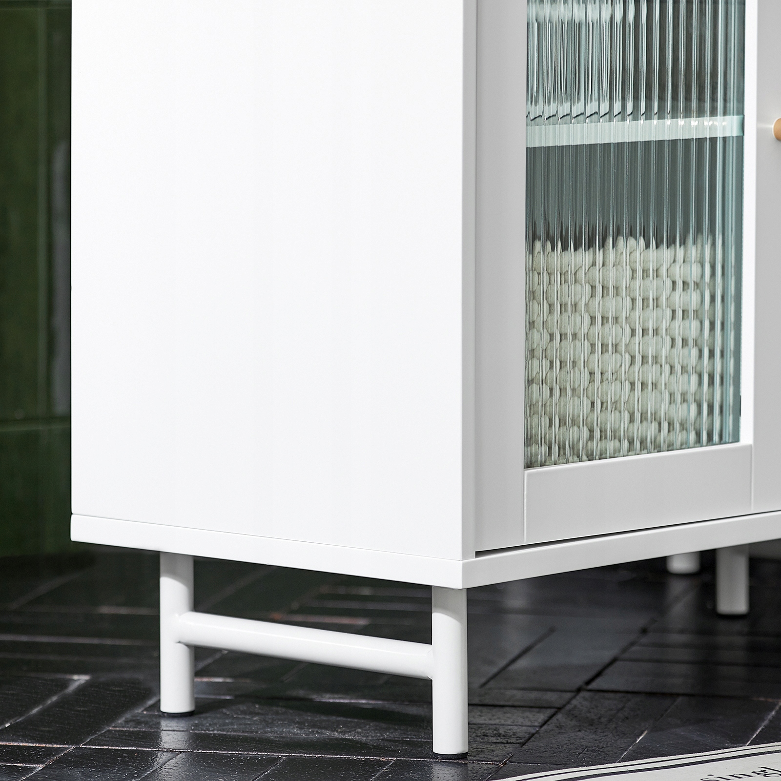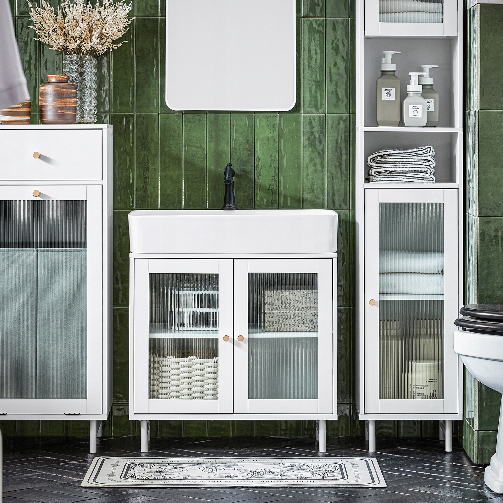 Шкаф для ванной со стеклянными дверцами делает их больше, чем закрытые спереди.