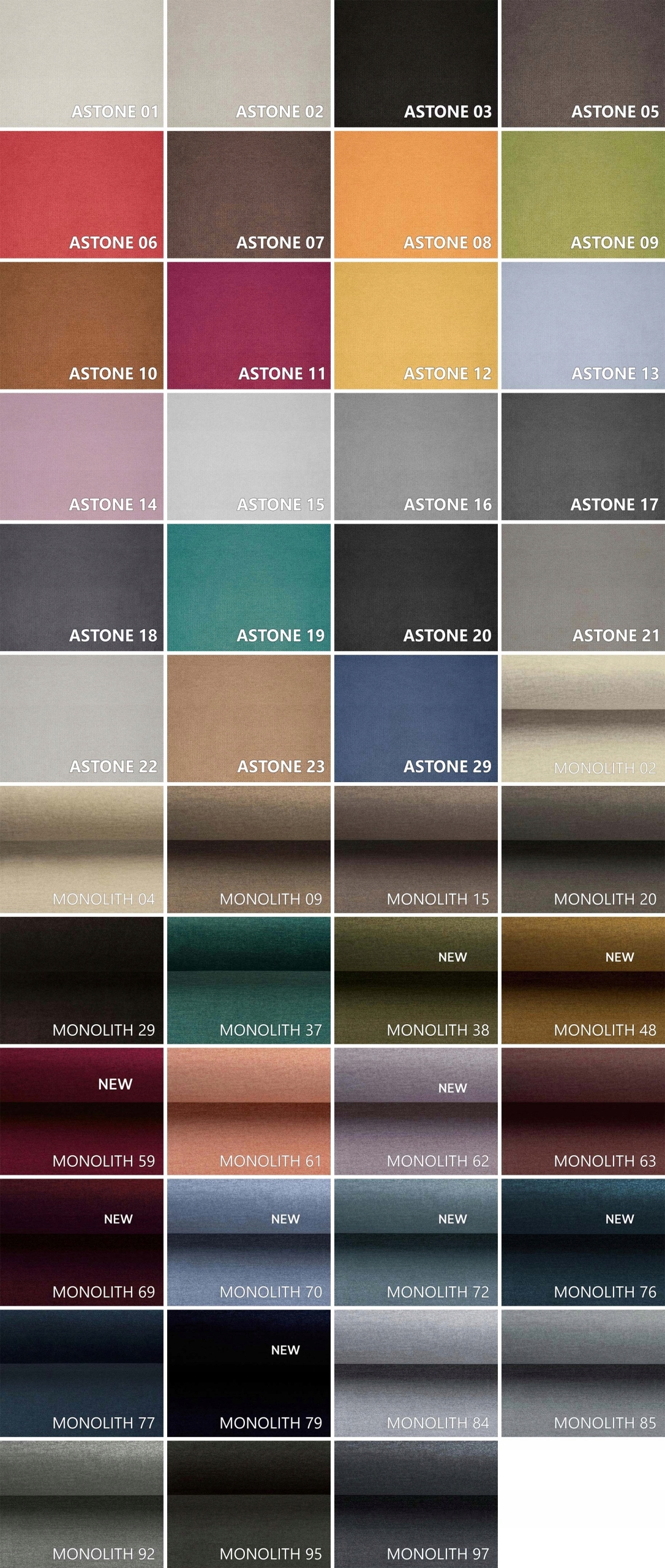 Astone – приятная на ощупь обивочная ткань с плюшевым отливом, плотностью 350 г/м2. Очищать его можно мягкой тканью, смоченной мягким моющим средством (мылом). Эта ткань не впитывает пролитую жидкость, а в случае пролития капли скапливаются на ее поверхности. Благодаря этому он идеально подходит для мягкой мебели.