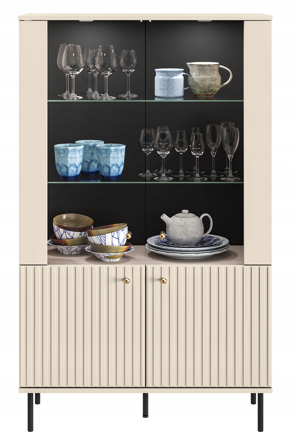 Стильная отделка, Кашмирские фронты MDF с декоративными, фрезерованными ламеллами дают элегантность мебели, что дополнительно подчеркивается гармонизирующими металлическими грибными золотыми ручками. Блэк -металлические ножки не только идеально сочетаются с декором, но, прежде всего, облегчает поддержание чистоты под мебелью, также путем чистки роботов.