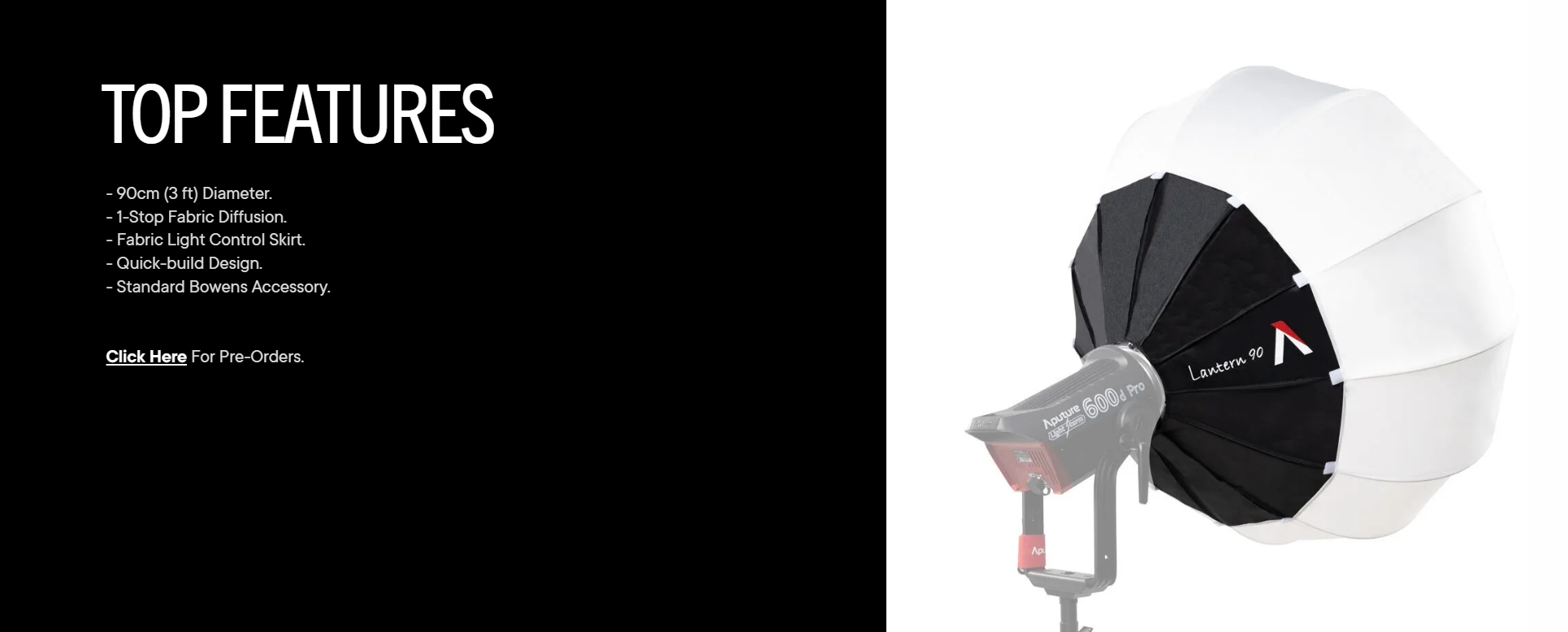Aputure Lantern 90 — универсальный модификатор света характерной формы фонаря. Софтбокс оснащен универсальным креплением Bowens, совместимым с сотнями ламп, доступных на рынке. Его диаметр в разложенном виде составляет целых 90 см. Благодаря зонтичной конструкции модификатор может быть готов к использованию всего за несколько секунд. Специальная крышка позволит вам свободно формировать свет и точно регулировать угол его падения в соответствии с потребностями ваших рам. В комплект входит сумка, облегчающая хранение и транспортировку.