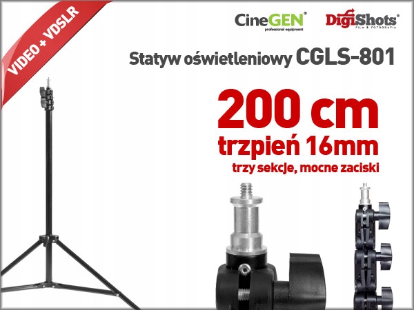 Световой, студийно-уличный, трехсекционный осветительный стенд. Максимальная высота 200 см, рабочая высота 190 см, удобные зажимы секций, студийная головка 16 мм с универсальной резьбой 1/4 дюйма. Штатив предназначен для работы с лампами и осветительными комплектами небольшого и среднего размера. Идеально подходит для конфигураций с лампами. вспышка и постоянный свет, софтбоксы, галогенные лампы типа RedHead.